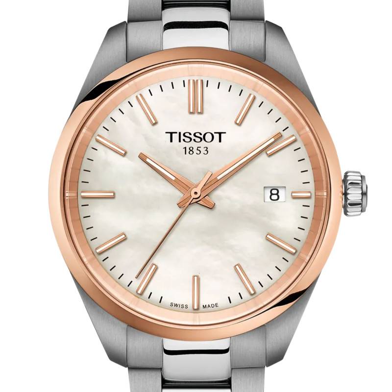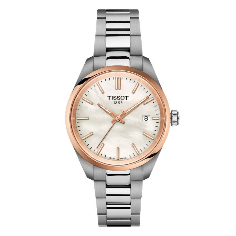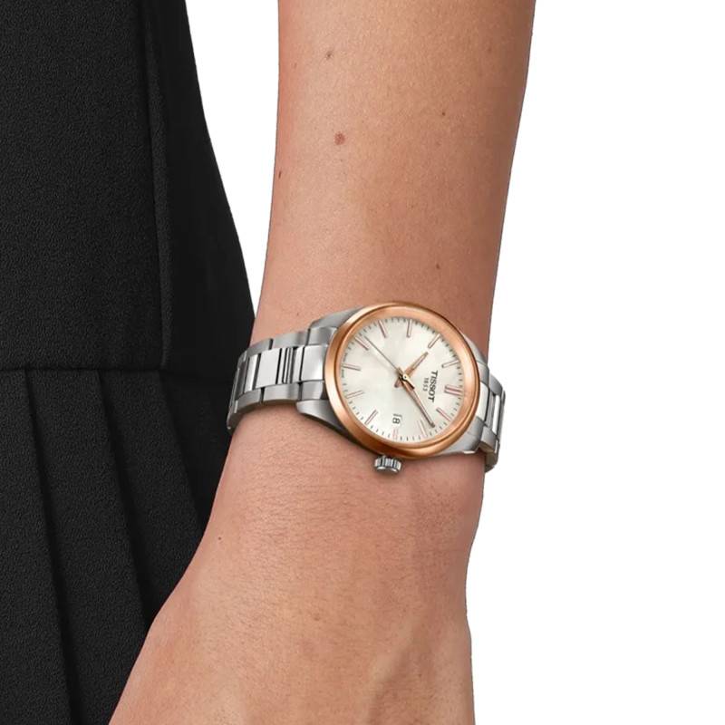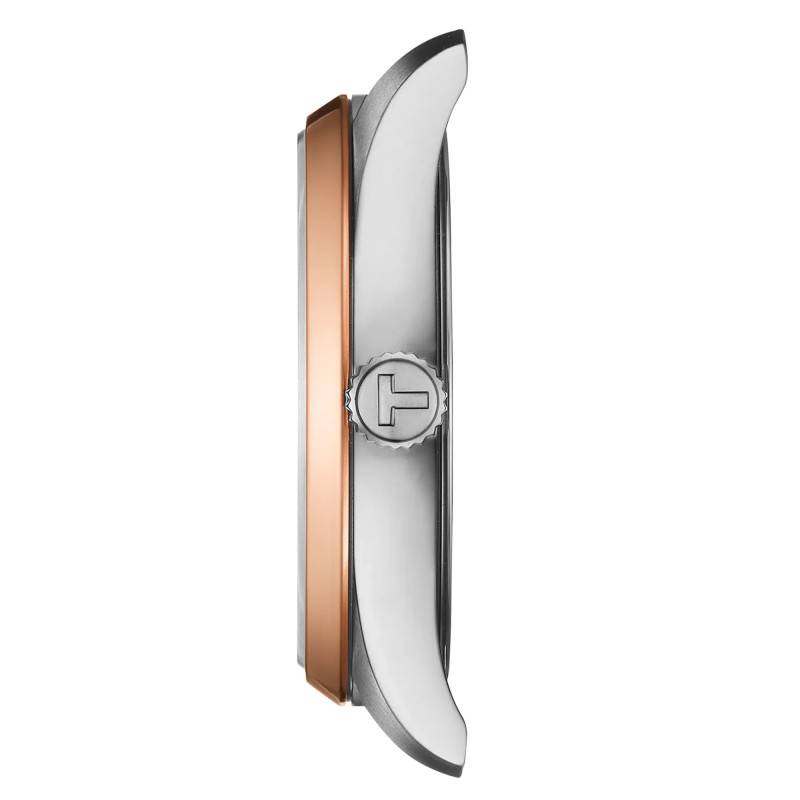 La montre Tissot PR 100 se distingue par son élégance intemporelle et sa précision suisse. Le boîtier de forme ronde, mesurant 34mm de diamètre et 8,25mm d'épaisseur, est réalisé en acier inoxydable 316L, garantissant robustesse et longévité. La beauté de cette montre est rehaussée par une lunette traitée en PVD rose, apportant une touche de féminité et de modernité. Le fond de la montre emboîté assure une finition soignée et une protection optimale du mécanisme interne. Le verre saphir plat recouvre le cadran et protège les éléments délicatement disposés en son sein.