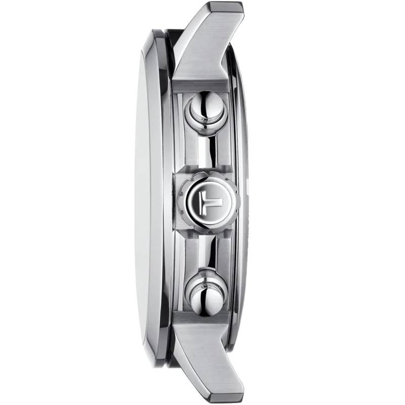 La maison horlogère Tissot vous présente son nouveau garde-temps issu de sa collection T-Sport. Ce modèle chronographe a la particularité de fonctionner à l'aide d'un mouvement à quartz. Cher à la maison, son côté sportif est mis en évidence sur l'ensemble de ce modèle. Vous retrouverez par exemple son boîtier en acier 316L, matière reconnue pour son efficacité contre l'oxydation et sa robustesse. Son diamètre de 44 mm et son épaisseur de 16.28 mm sont des dimensions idéales pour habiller un poignet masculin avec élégance. De plus, le côté racing se retrouve par sa lunette fixe à la finition polie qui abrite à 3 heure une couronne remontoir. Cette dernière est utilisée pour régler les aiguilles des heures et des minutes. Elle est encerclée par deux boutons-poussoirs situés à 2 heures et 4 heures qui feront fonctionner les complications horlogères situées sur le cadran. Son fond de boîte est emboîté et vous garantira une excellente étanchéité jusqu'à 200 m de profondeur.