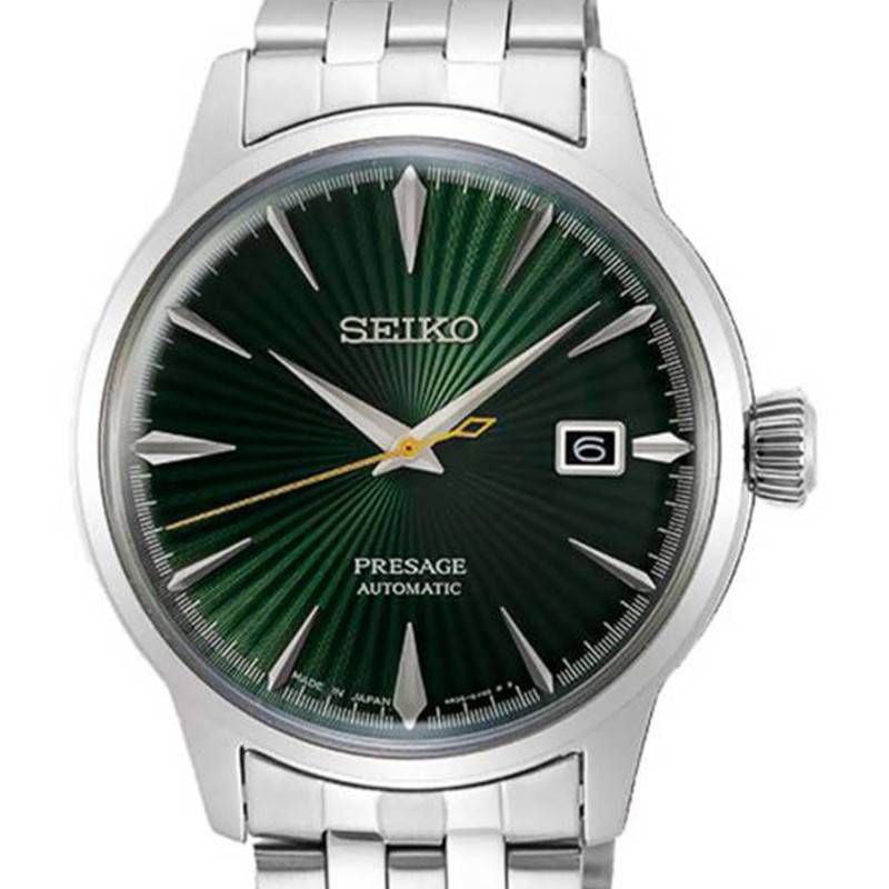 Le cadran s'inspire donc des teintes de citron vert et de menthe que l'on retrouve dans le cocktail Mockingbird. Ces douces nuances de vert contrastent grâce à un fond plus foncé et une finition soleillée apportant une touche de luminosité. Les indicateurs temporels sont tout autant raffinés et en harmonie avec le boîtier en acier. Au centre, deux aiguilles de forme dauphine indiqueront les heures et les minutes, tandis que la trotteuse de couleur dorée avancera au fil des secondes. Les aiguilles pointeront un chemin de fer des minutes complété par des index fins et argentés représentant les heures. Pour vous rappeler la date du jour, un guichet est présent à côté de l'index des trois heures. Ce Presage Cocktail est signé Seiko sous l'index des douze heures tandis que le nom de la collection ainsi que le mouvement sont précisés à six heures.