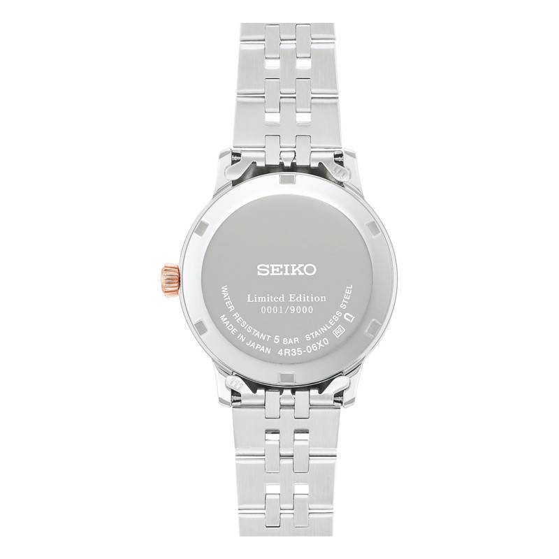 La montre Seiko Presage est un hommage à l'horlogerie japonaise, alliant qualité et esthétisme dans un format à la fois compact et sophistiqué. Le boîtier présente une forme ronde classique, mesurant 34 mm de diamètre et avec une épaisseur de 10,89 mm, un choix idéal pour celles qui recherchent un modèle féminin exprimant une subtile élégance. Fabriqué en acier inoxydable, il est à la fois résistant et brillant, grâce à une finition polie et un traitement PVD rose. Ce choix de matière assure à la montre non seulement une allure luxueuse mais également une durabilité remarquable. De plus, elle figure parmi les 9000 exemplaires de cette édition limitée, un fait qui en fait une pièce de collection recherchée. La montre est protégée par un verre bombé en Hardlex, matériau choisi pour sa résistance remarquable aux rayures.