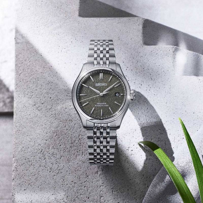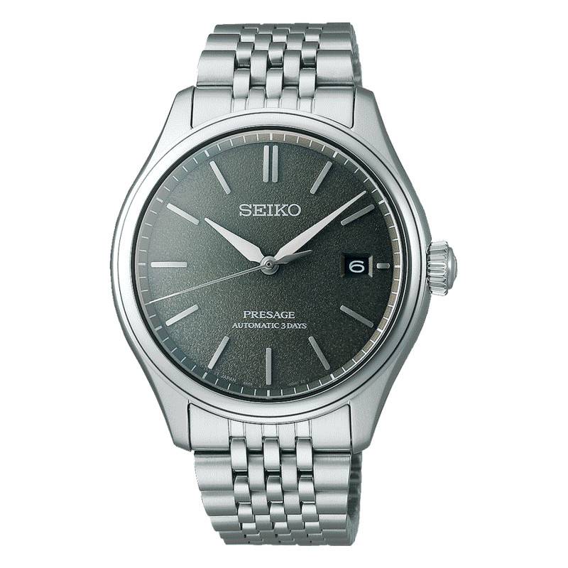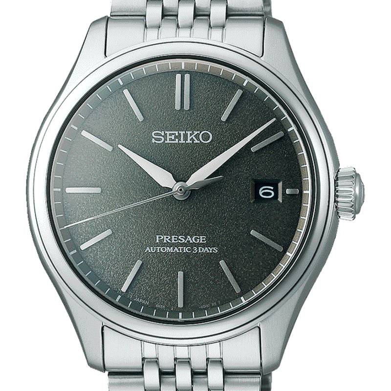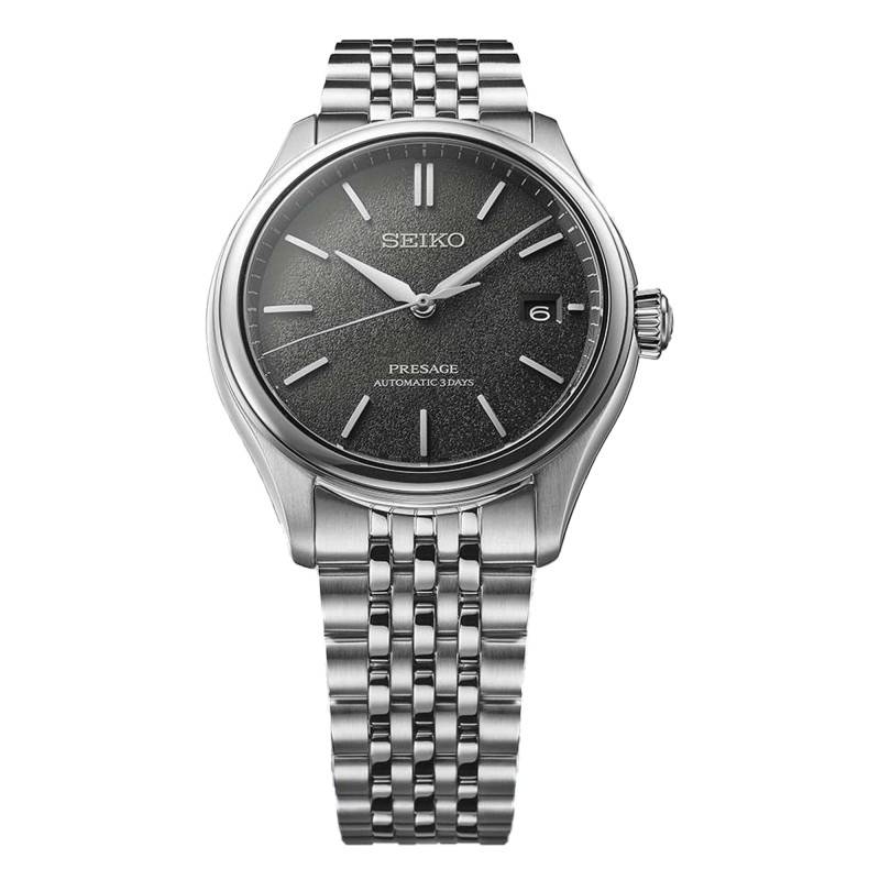 Un délicat cadran de forme ronde et au design incurvé trouve sa place avec finesse au sein du boîtier, accordant à la montre un aspect de sobriété plus profond par sa belle couleur gris foncé. Puisant ses inspirations de la texture douce et souple de la soie tissée fortement liée à la culture japonaise, il présente un fond sablé avec des marqueurs temporels argentés qui vous permettront un affichage fluide et net de l'heure. Deux aiguilles “Alpha” s'animent au centre en compagnie d'une fine trotteuse, marquant toutes les trois le passage des heures, des minutes et des secondes. Par ailleurs, le pourtour loge un chemin de fer des minutes marqué par des traits gris. Ce dernier entoure douze index bâtons, dont un double bâton à midi pour un effet plus captivant, qui vous aideront à repérer facilement les heures. L'index de 3h est moins large, laissant place à un guichet de fond noir. Ce dernier vous indiquera la date par le biais de chiffres arabes blancs. Pour finir, la marque appose son nom sous 12h en guise de signature et rappelle vers 6h le type de mouvement et l'autonomie de la montre en dessous du nom de la collection “Presage”.