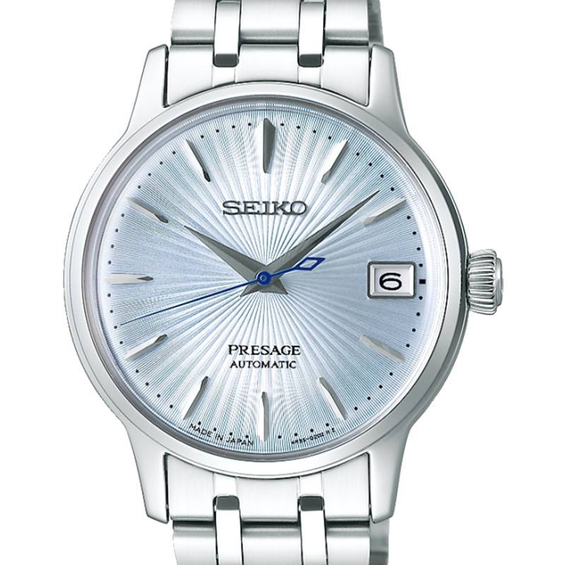 La maison horlogère japonaise Seiko continue sa collection Presage Cocktail inspirée de la sophistication des bars à cocktail en confectionnant des montres dont les couleurs représentent une boisson alcoolisée bien spécifique. Ici, ce modèle automatique s'inspire du cocktail Sky Diving. Pour séduire les femmes, il s'arme un boîtier de forme ronde et en acier inoxydable affichant un diamètre de 33.8 millimètre. Classique de la manufacture Seiko, c'est un verre Hardlex légèrement bombé et ultra-résistant aux chocs, qui protège le cadran. A trois heures du boîtier, vous retrouverez cette couronne remontoir destinée au remontage manuel, si vous en éprouvez la nécessité. Tel un barman de renom, Seiko vous laisse entrevoir sa recette à travers un fond de boîte vissé et transparent grâce à un verre saphir. Ainsi, cette conception autorisera une étanchéité de 5 ATM.