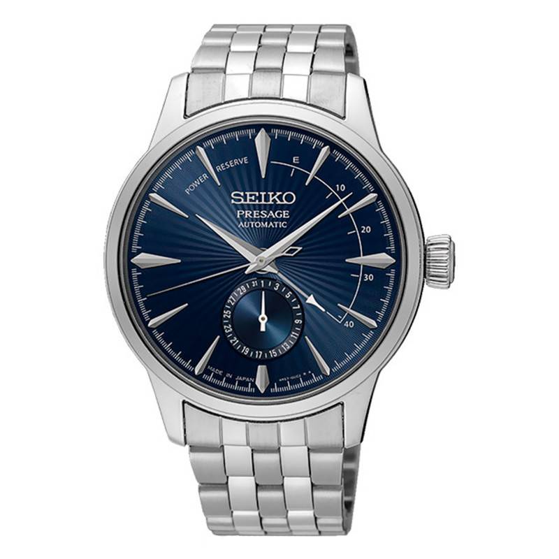 Marque d'horlogerie connue à travers le monde, Seiko vous propose des garde-temps alliant qualité, design intemporel et élégant, et prix abordables. Conçue avec le savoir-faire nippon de la marque, la Présage Cocktail "Blue Moon" SSA347J1 ne vous décevra pas et vous offrira une qualité de lecture optimale. Celle-ci se pare d'un boîtier rond en acier inoxydable poli et de couleur argentée, mesurant 40,5 millimètres de diamètre pour 14,4 millimètres d'épaisseur, abritant un cadran soleillé de couleur bleue. Très harmonieux, celui-ci se compose divers éléments favorisant votre lecture de l'heure. Ainsi, vous trouverez en son centre trois aiguilles, deux aiguilles dauphines et une trotteuse, accompagnées d'un compteur de date ainsi que d'un index "lances" et un chemin de fer des minutes. Vous observerez également sur la partie droite du cadran un indicateur de réserve de marche vous permettant ainsi de savoir si votre montre a besoin de mouvement ou non. Dans le prolongement des trois heures est disposée une couronne remontoir qui vous permettra de régler l'heure de votre montre si vous en avez le besoin, bien que la Présage Cocktail "Blue Moon" SSA347J1 soit équipée d'un mouvement automatique. Le cadran est surplombé par un verre hardlex bombé qui fait office de protection contre les potentiels coups et rayures pouvant survenir. Pour finir, ce garde-temps possède une étanchéité de 5 ATM, ce qui correspond à 50 mètres, possible grâce à son fond de boîte vissé et transparent.