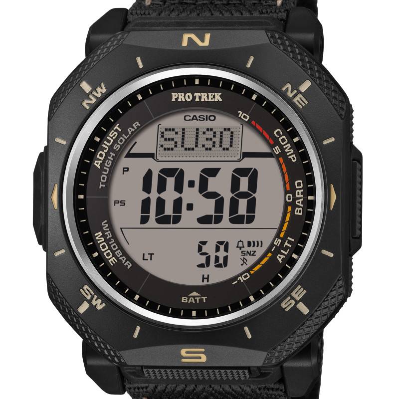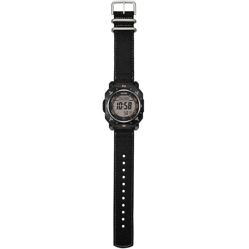 Le cadran de la Pro Trek PRG-69B-1ER est une merveille de lisibilité et de fonctionnalité. Son affichage numérique est impeccablement clair, grâce au système Super Illuminator qui permet de lire facilement l'heure dans toutes les conditions lumineuses. Chaque information : heures, minutes, secondes, ainsi que date, jour, et mois, est soigneusement disposée pour maximiser la lisibilité. Le cadran numérique se distingue par sa simplicité pratique, évitant tout encombrement visuel. Les utilisateurs peuvent fonder une confiance totale en ce garde-temps, grâce à une interface intuitive qui permet d'accéder instantanément à un altimètre, un baromètre, une boussole, et un thermomètre.