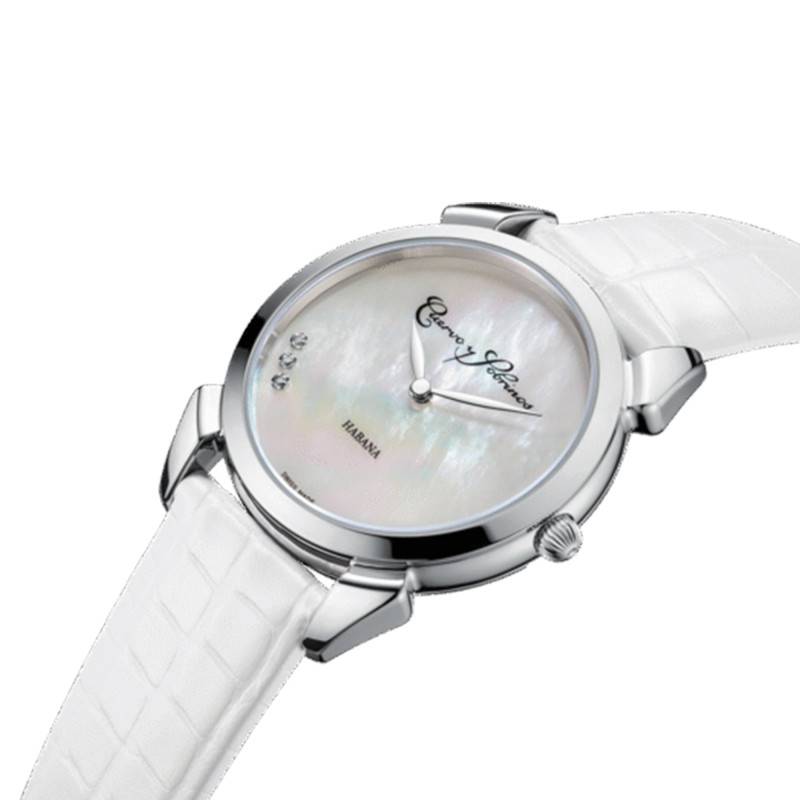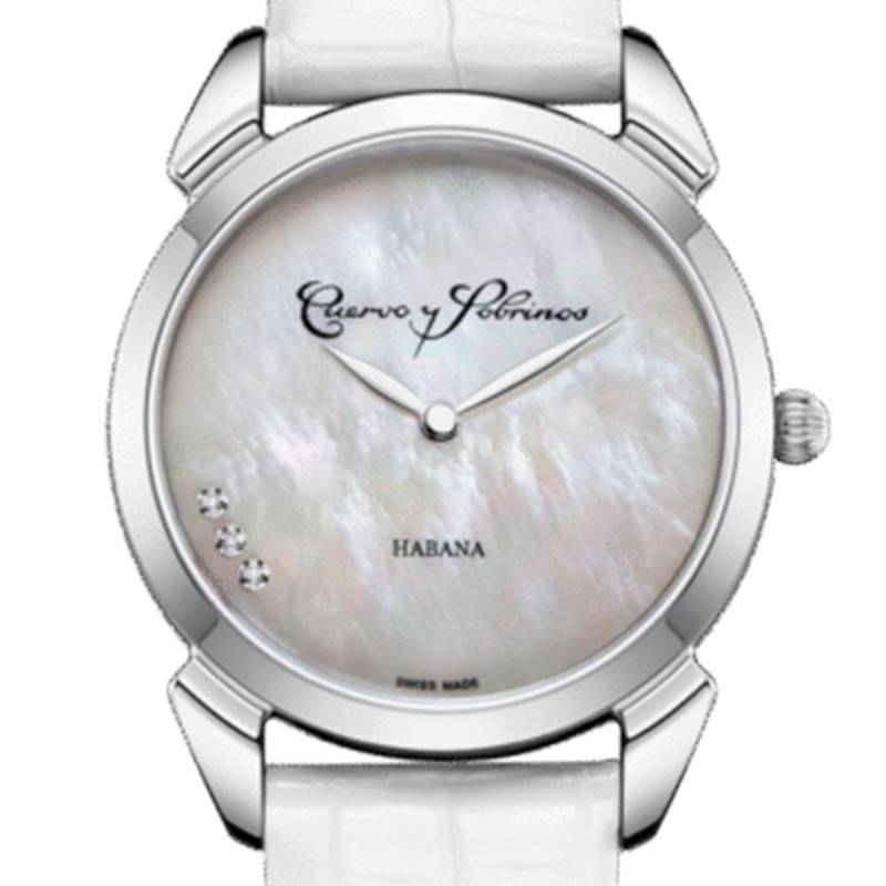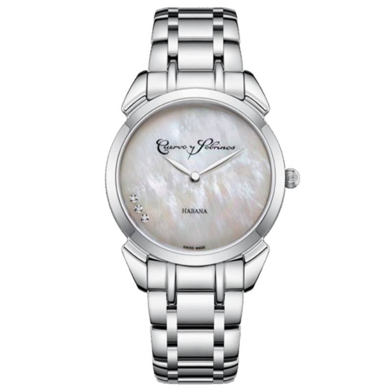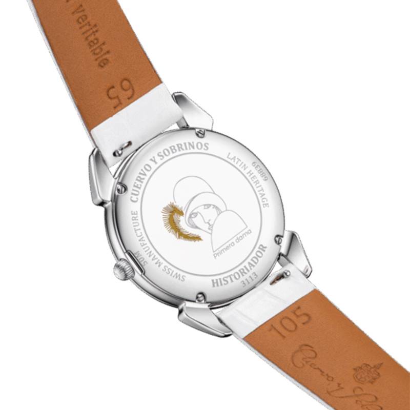 Le cadran de la montre Cuervo y Sobrinos est un véritable spectacle pour les yeux. Sa finition nacrée, ornée de subtiles incrustations de diamants, capture la lumière d'une manière magique, évoquant le glamour et l'opulence des années 1930 à La Havane. Les aiguilles élégantes, animées par un mouvement quartz de haute précision, parcourent doucement la surface, indiquant les heures et minutes avec grâce et délicatesse. Les choix de teintes blanches et grises apportent une harmonie visuelle qui s'accorde parfaitement avec l'ensemble du design. Enfin, sa protection est assurée par un verre saphir bombé, avec un traitement antireflets, offrant à la fois clarté et durabilité.