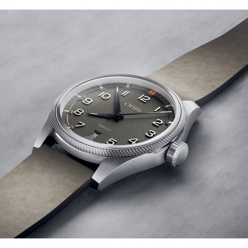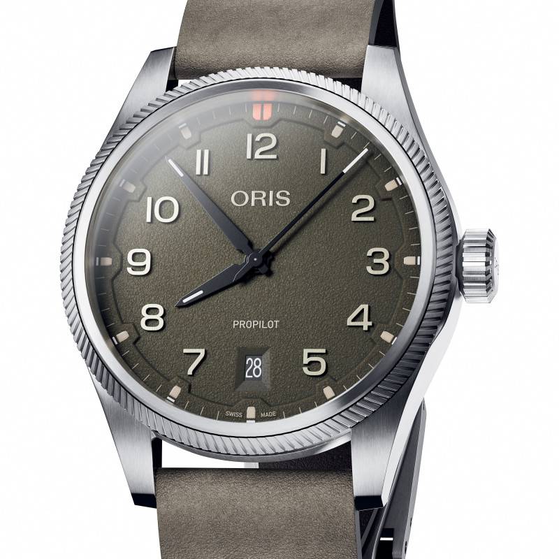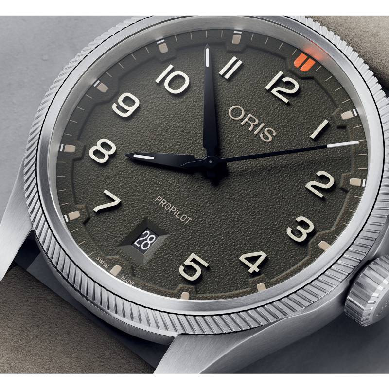 Le cadran de cette Oris ProPilot Date Kaki arbore une teinte verte texturée. Les chiffres arabes offrent une lisibilité instantanée, renforcée par les aiguilles et index revêtus de SuperLuminova qui garantissent une visibilité parfaite même dans l'obscurité. Ce cadran, accueillant également un guichet date à 6 heures, est entouré d'un chemin de fer des minutes pour une précision accrue.