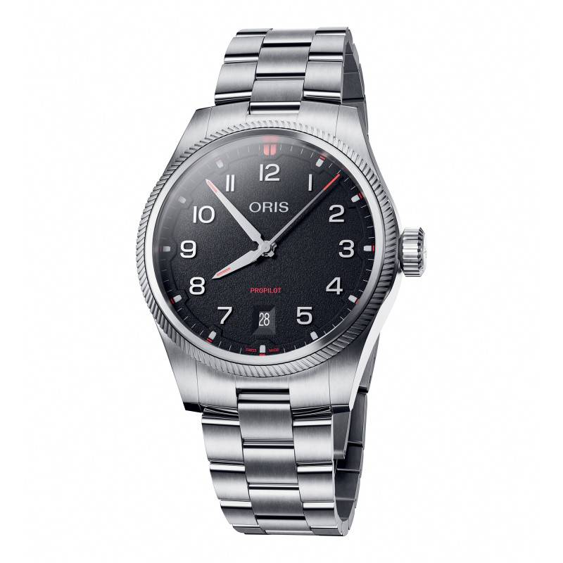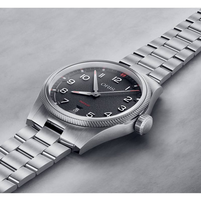 La montre ProPilot Date Noire 733 7805 4164-07 8 20 04LC d'Oris incarne l'excellence de l'horlogerie suisse avec une présence imposante et raffinée. Ce garde-temps est présenté dans un boîtier rond de 41 mm de diamètre, conçu en acier inoxydable, assurant à la fois résistance et allure sophistiquée. Son épaisseur de 11,70 mm lui confère une personnalité affirmée, tout en restant discrète au poignet. Le boîtier est savamment travaillé avec des finitions mates (brossées/satinées), apportant un contraste subtil avec la lunette cannelée qui attire immédiatement le regard.