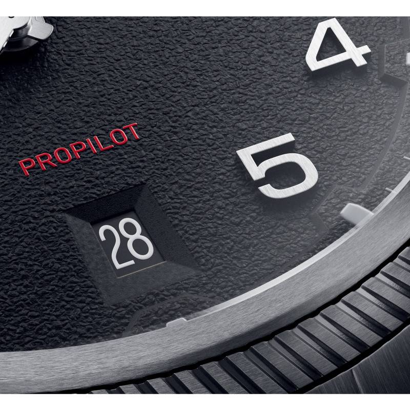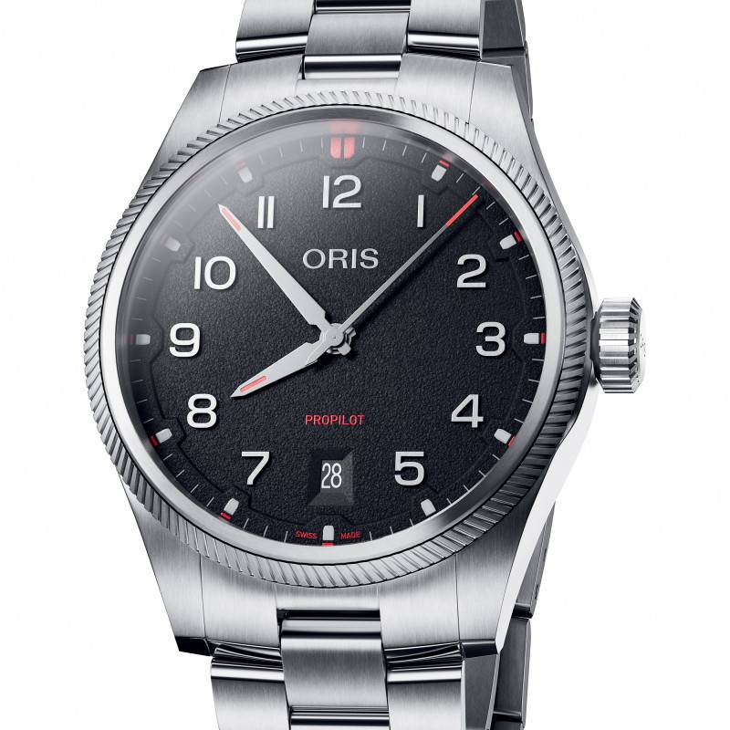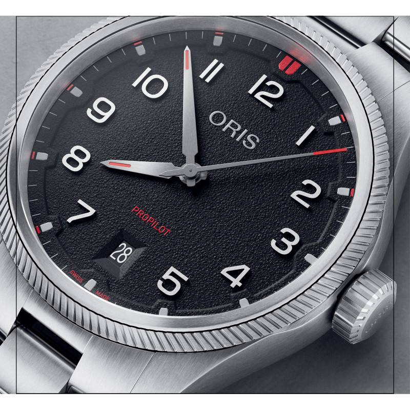 Le cadran de la ProPilot d'Oris, de couleur noire texturée, offre une toile parfaite pour les chiffres arabes clairs et les aiguilles empreintes de SuperLuminova, qui garantissent une lecture aisée de l'heure même dans les conditions de faible luminosité. Tandis que le chemin de fer des minutes entoure délicatement l'extérieur du cadran, chaque détail est conçu pour augmenter la précision et la lisibilité. Les aiguilles, en particulier, allient esthétique et efficacité grâce à leur revêtement luminescent, indispensable pour les aventuriers modernes. Un guichet date subtile à 6 heures ajoute une fonctionnalité supplémentaire sans encombrer le design global, traduisant un équilibre entre fonctionnalité et esthétique.