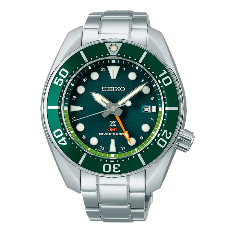 Retranscrivant l'héritage de Seiko et l'intégrité développée par la marque en misant sur la simplicité, l'harmonie, la puissance et la présence, ce cadran est paré d'indicateurs temporels favorisant la lecture horaire. Texturé et présentant une couleur verte, ce dernier évoque le mouvement gracieux des océans. Il est muni d'une aiguille GMT orange pointant les chiffres arabes et oscillant une fois toutes 24 heures afin de vous communiquer les heures du second fuseau horaire. Les heures et les minutes vous seront indiquées respectivement par une petite aiguille pointant des index géométriques et par une grande aiguille pointant un chemin de fer placé à la circonférence. Revêtus d'un traitement lumibrite, ces indicateurs temporels vous indiqueront le temps même sous des conditions à faible luminosité. La fonction date vous sera indiquéedans un guichet situé à 3 heures. Le nom de la marque, quant à lui, est noté en dessous de 12 heures.