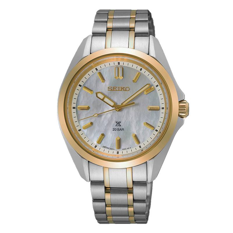Le bracelet de la montre Seiko Prospex Sea Lady est fabriqué en acier inoxydable, apportant une solidité et un style indéniable. La combinaison de couleurs entre le gris et le doré crée un effet visuel saisissant et sophistiqué, prêt à s'associer à toute tenue. Ce bracelet est conçu pour offrir le meilleur confort et la meilleure résistance, notamment grâce à une boucle déployante qui assure une sécurité maximale sans sacrifier à l'élégance. Avec une entrecorne de 16 mm, il s'adapte parfaitement au poignet, ajoutant à la fois un sentiment de luxe et de sécurité. En toutes occasions, ce bracelet se prête aux environnements chic, tout en restant très fonctionnel pour des activités plus sportives.