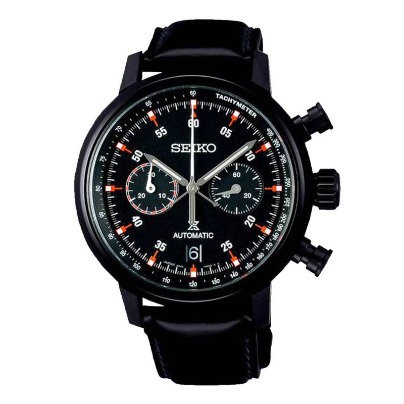 Dans un bel apparat noir foncé, le cadran rond de ce garde-temps vous offre un affichage analogique d'une clarté et d'une fluidité sans contexte. Avec délicatesse, il vous présente trois aiguilles, de teinte argentée qui contrastent parfaitement avec le fond. Celles des heures et des minutes sont en forme bâton, tandis que la fine trotteuse indique les secondes. Elles arpentent frénétiquement des index en chiffres arabes numérotés de 5 à 60. Ils sont rehaussés par un chemin de fer de minutes ponctué de minis rectangles rouges. Afin de vous permettre de distinguer tous ces éléments dans les endroits sombres, les index et les aiguilles disposent d'un revêtement luminescent lumibrite. Par ailleurs, le cadran est équipé d'une échelle tachymétrique placée sur son rehaut qui servira à déterminer les vitesses de déplacement. Conçus pour être votre meilleur allié dans vos challenges, la maison a équipé ce modèle de deux compteurs additionnels des plus sophistiqués. Le premier se place à 3 heures et indique la fonction 60 secondes. Le second, à 9 heures, indique la fonction 30 minutes. Le guichet date positionné à 6 heures vous indiquera le jour. Pour finir, Seiko signe son fabuleux modèle de son nom à midi et rappelle le type de mouvement au-dessus de 6 heures.