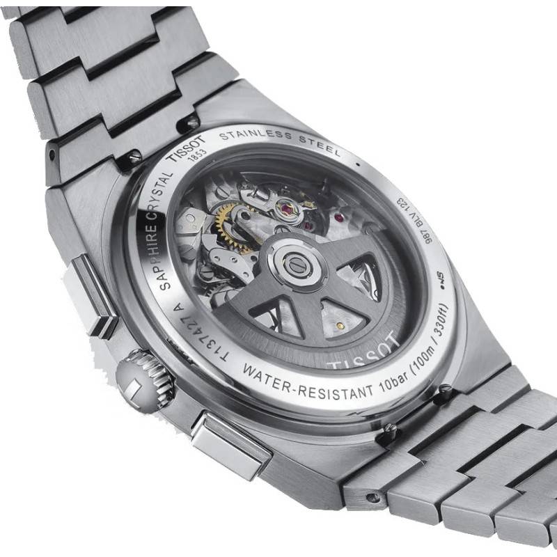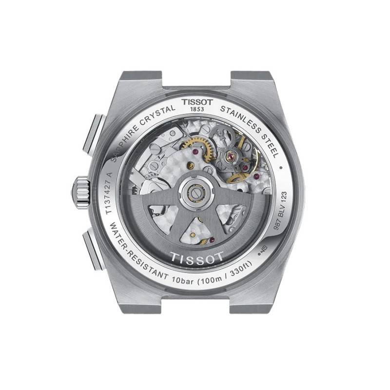 Fondée en 1853, a célèbre maison horlogère suisse Tissot représente les « innovateurs par Tradition ». La marque nous dévoile un modèle qui ne date pas d'hier, la PRX Chronograph Silver T137.427.11.011.00. En effet, la PRX Automatic Chronograph est la dérivée d'un ancien modèle apparu en 1978. Ce dernier avait un boîtier en forme de tonneau équipé d'un mouvement quartz et accompagné d'un bracelet en acier. La PRX Chronograph de 2022 dispose également d'un boîtier de forme tonneau en acier inoxydable gris qui a sur son côté droit 1 bouton remontoir à 3 heures et 2 boutons poussoirs à 2 et 4 heures. Ils vous permettront de régler l'heure et d'utiliser la fonction chronographe. Le boîtier mesure 42 mm de diamètre. Ensuite, grâce au fond de boîte transparent, vous pourrez observer le mécanisme automatique. Comme pour le cadran, le fond de boîte est protégé par un solide verre en saphir. Puis, comme c'est indiqué subtilement dans le nom PRX, l'étanchéité du garde-temps est de X ATM soit 10 ATM. Enfin, la montre dispose d'une garantie internationale de 2 ans.