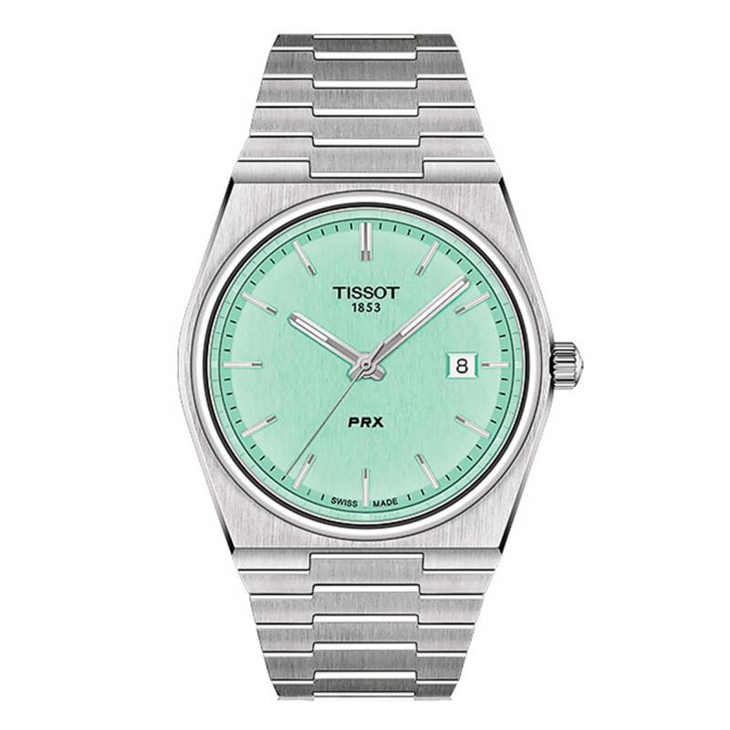 Cette nouvelle montre Tissot dispose d'un sublime cadran de teinte vert menthe, dont la finition s'avère être brossée à la verticale. Le rehaut se voit être entièrement poli, avec un effet miroir reflétant la bordure extérieure du cadran. Les index des heures, de type bâton, ont été conçus en acier inoxydable poli. Ils disposent en leur centre de matière luminescente vous offrant la possibilité lire l'heure de nuit. Ils sont appuyés dans leur tâche par un chemin de fer des minutes, de couleur noire. Les aiguilles des heures et des minutes affichent une forme également "bâton". Leur finition alterne entre des zones polies et satinées, du plus bel effet. De même que les index des heures, ils ont bénéficié d'un traitement de matière luminescente en leur sein. Une fine trotteuse comptera les délicates secondes du temps qui s'écoule. Parce qu'il est toujours bien pratique de connaître la date du jour, vous trouverez un guichet-date placé à 3h. Inscrit à la base du cadran, vous pourrez lire la mention "Swiss made". Légèrement plus haut, le nom de la collection de la montre, "PRX". Pour conclure cette partie, notez que la maison suisse authentifie sa montre à midi.