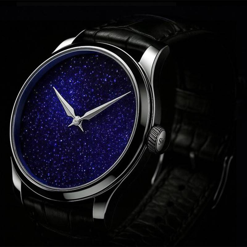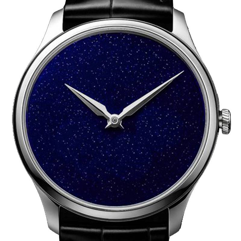 Le cadran de la Purista Aventu est une véritable œuvre d'art. Fabriqué avec de la pierre aventurine, son bleu profond est étoilé de particules scintillantes qui rappellent un ciel nocturne. Les aiguilles en acier contrastent de façon élégante avec ce fond étoilé, facilitant une lecture précise et claire de l'heure. L'absence d'indicateurs numériques renforce l'aspect minimaliste et épuré, laissant la beauté naturelle de l'aventurine s'exprimer pleinement sous la protection d'un verre saphir plat, inrayable et cristallin.