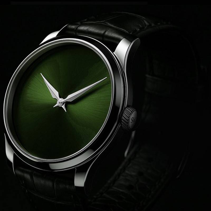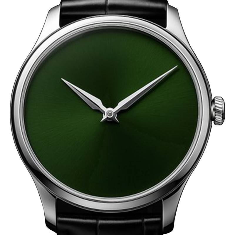 Le cadran de cette montre se distingue par une superbe finition brossée et soleillée, attirant subtilement la lumière pour un effet des plus séduisants. D'un vert intense, il crée un contraste harmonieux avec les aiguilles finement polies. Le design minimaliste du cadran, dépourvu d'index visible, met tout au premier plan sa pureté et son élégance. Les aiguilles se déplacent gracieusement pour indiquer les heures et minutes avec une précision remarquable.
