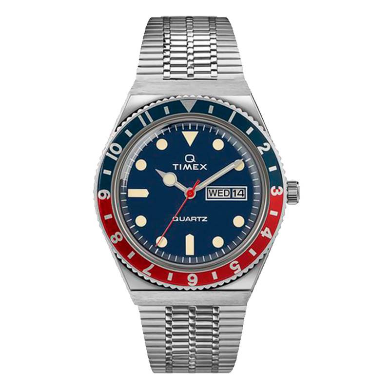 Timex s'inspire de sa première montre plongeuse Q Timex sortie en 1979 et crée ce nouveau modèle dans l'air du temps. Dotée d'un mouvement à quartz, la nouvelle Q Timex 2019 reprend les traits vintage et les détails de son aînée. En effet, la montre se compose d'un boîtier en acier inoxydable de forme tonneau. Celui-ci présente une finition à la fois brossée et polie et mesure 38mm de diamètre pour 11.5mm d'épaisseur. Cette taille idéale conviendra autant aux poignets féminins que masculins. Afin de protéger le cadran de la poussière et d'éventuels chocs inopinés, un verre minéral bombé le surplombe. De plus, une lunette bi-directionnelle pepsi, rouge et bleue, entoure la glace. Graduée, elle reprend l'esthétisme des lunettes des montres plongeuses qui permettent de mesurer le temps d'immersion. En outre, une couronne remontoir loge traditionnellement à trois heures et vous permet d'ajuster les éléments qui ornent le cadran. Enfin, le fond de boîte est maintenu par des vis et vous assure une étanchéité de 5 ATM soit 50 mètres.