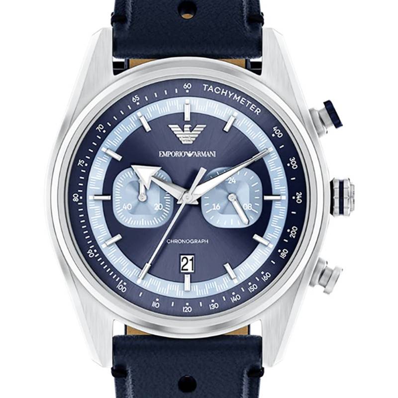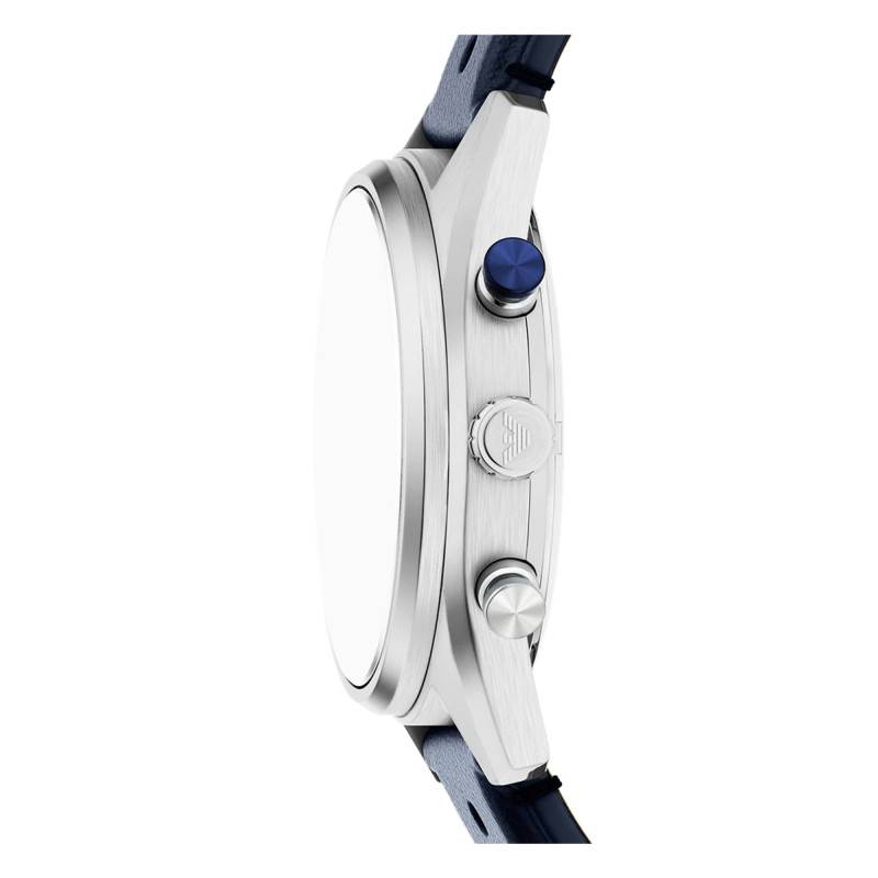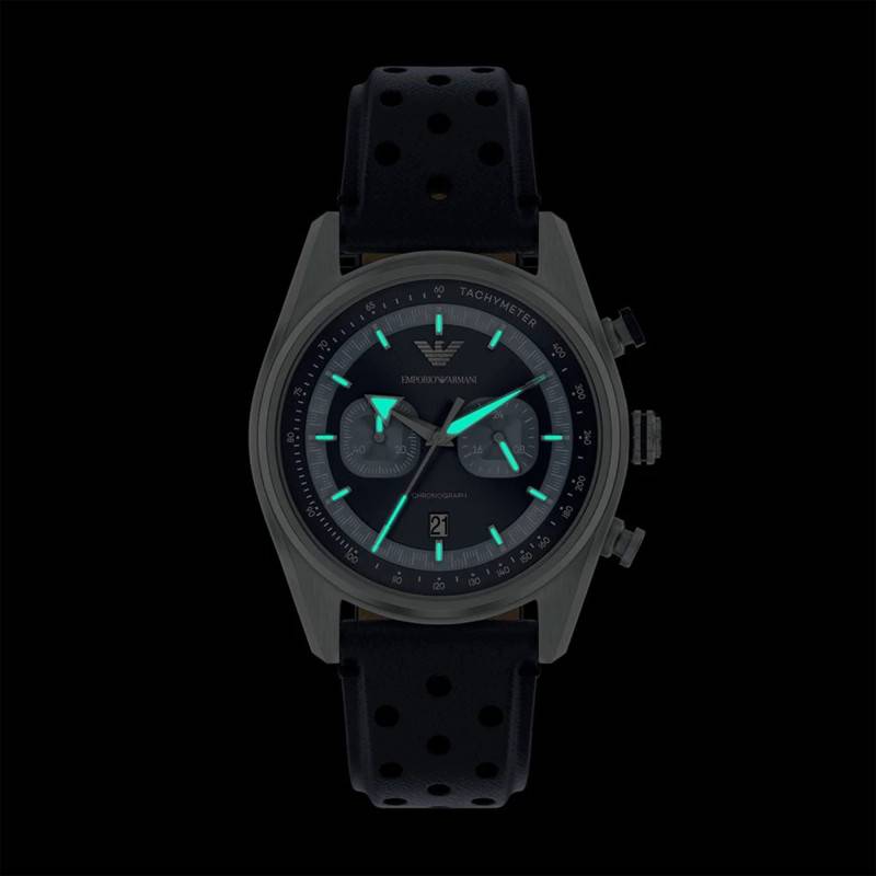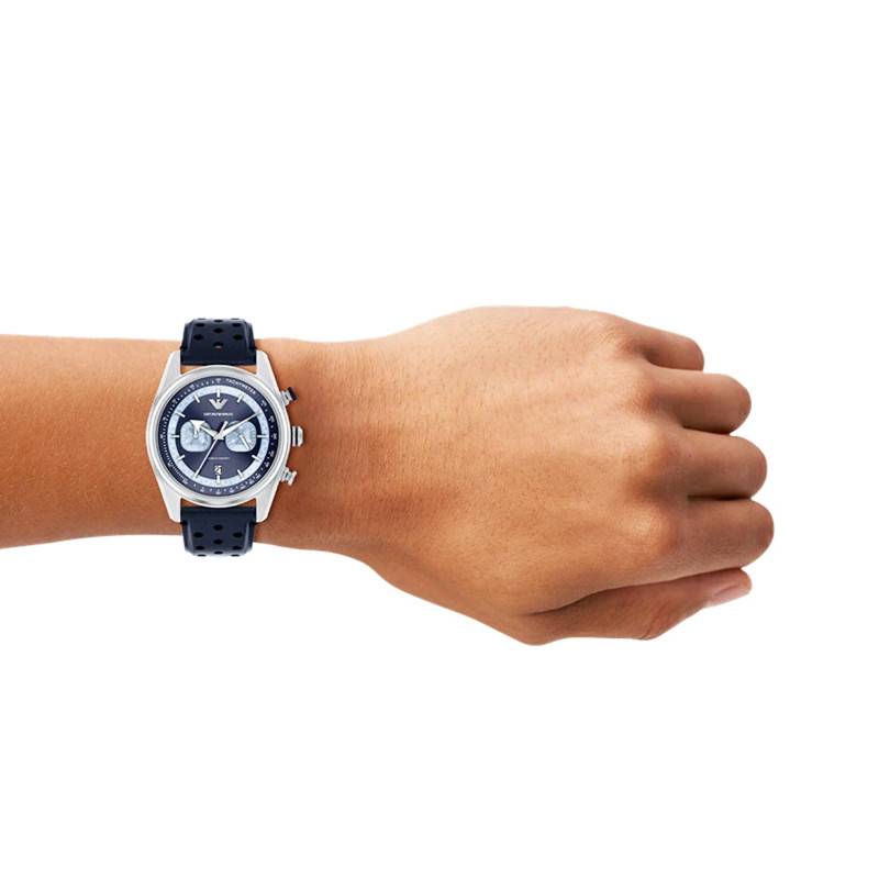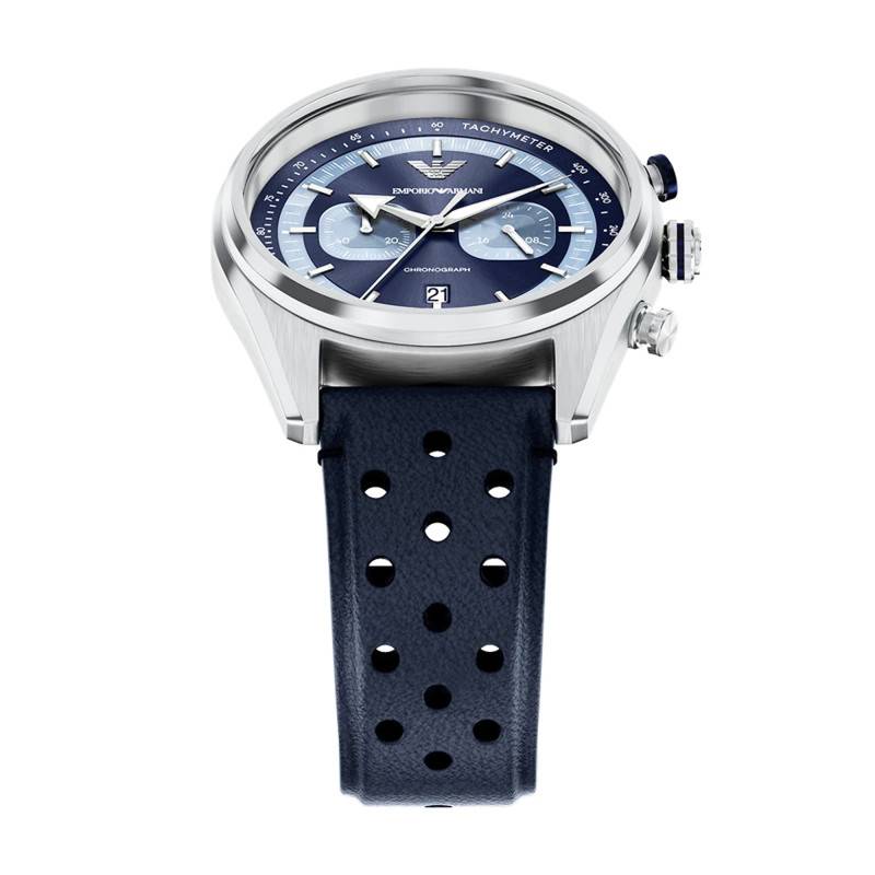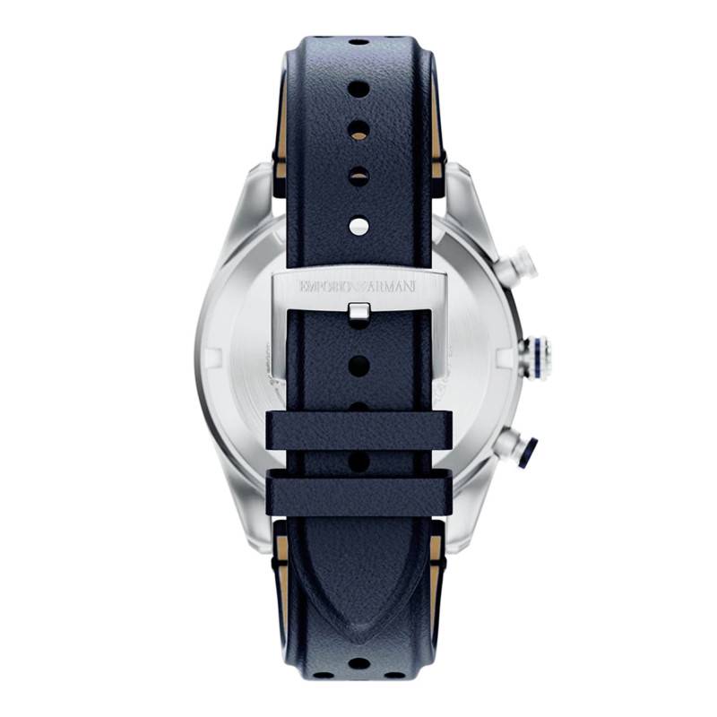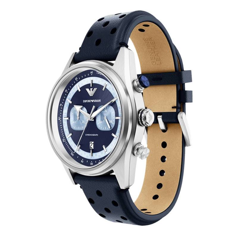 La montre Emporio Armani, modèle Racer, se distingue par un design à la fois sportif et élégant. Le boîtier rond de 42 mm de diamètre est fabriqué en acier inoxydable, offrant une robustesse digne des montres d’exception. L'épaisseur du boîtier est de 12 mm, ce qui lui confère une présence remarquable au poignet sans pour autant en compromettre le confort. La finition mate complète parfaitement le style global de cette montre. Le fond vissé garantit une protection accrue contre l’eau et les poussières, améliorant ainsi sa durabilité. Les boutons remontoir et poussoirs, placés judicieusement, facilitent la manipulation et le contrôle de ses multiples fonctions, notamment le chronographe.