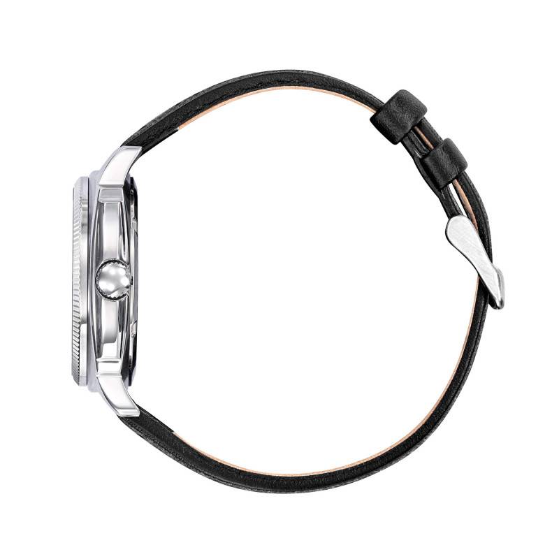 Le bracelet en cuir de vachette de cette montre se démarque par sa texture perforée, conférant une allure à la fois classique et moderne. Sa coloration noire élégante s'assortit parfaitement au cadran gris, créant un contraste harmonieux et sophistiqué. Avec une largeur d'entrecorne de 20 mm, ce bracelet offre un ajustement confortable au poignet, renforcé par une boucle ardillon pratique qui assure une fermeture sécurisée. Ce choix de matériau garantit également durabilité et confort d'utilisation au quotidien.