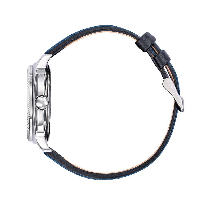Le bracelet, en cuir de vachette bleu, apporte à cette montre une touche de sophistication subtile et actuelle. Avec sa texture perforée et ses élégantes surpiqûres, il procure à la pièce un confort inégalé tout au long de la journée. La largeur de l'entrecorne est de 20 mm, ce qui assure une allure harmonieuse avec le boîtier. Le fermoir de type boucle ardillon simple et classique assure fermeté et praticité d'ajustement, offrant facilité et sécurité.
