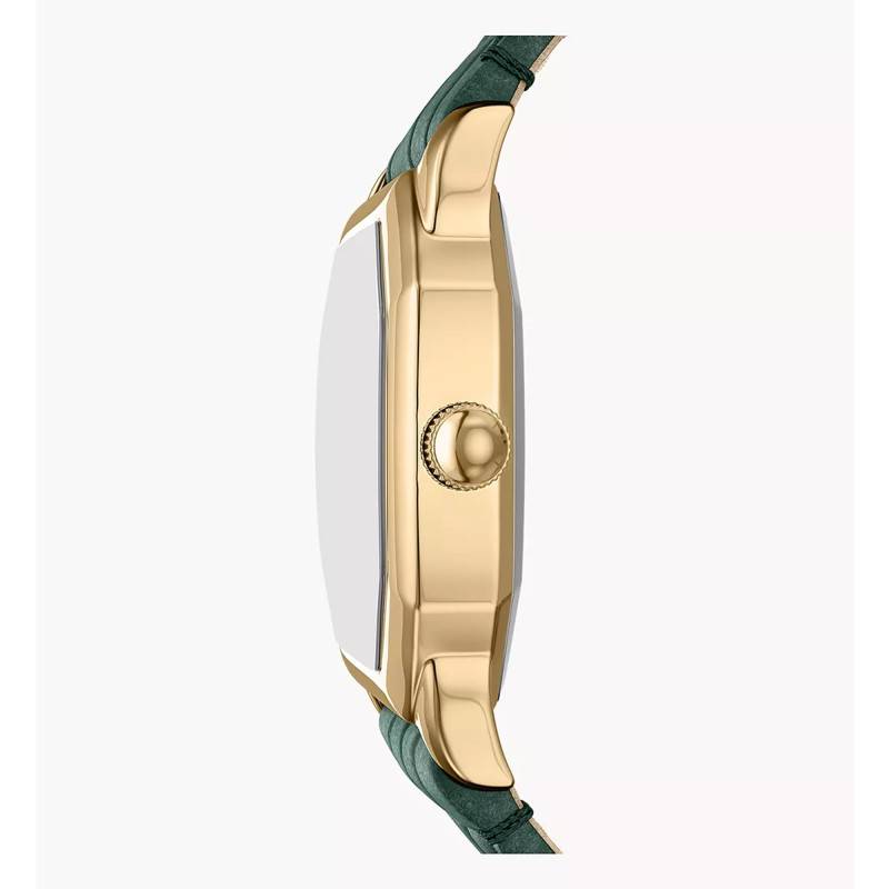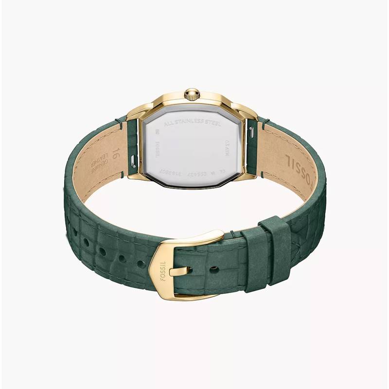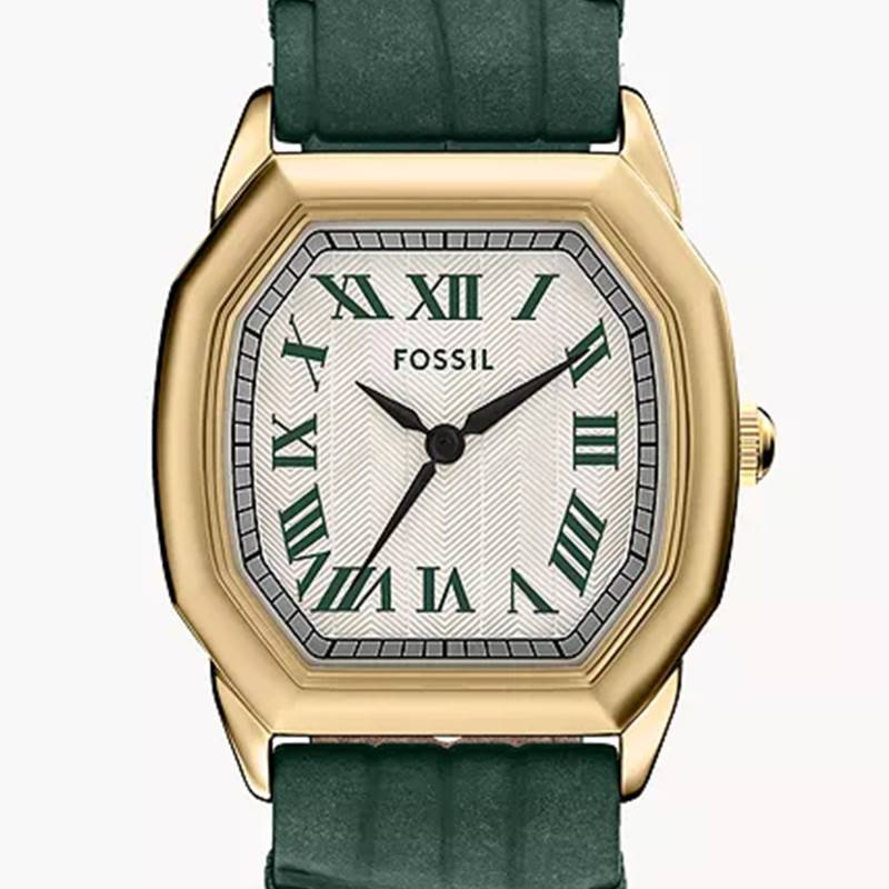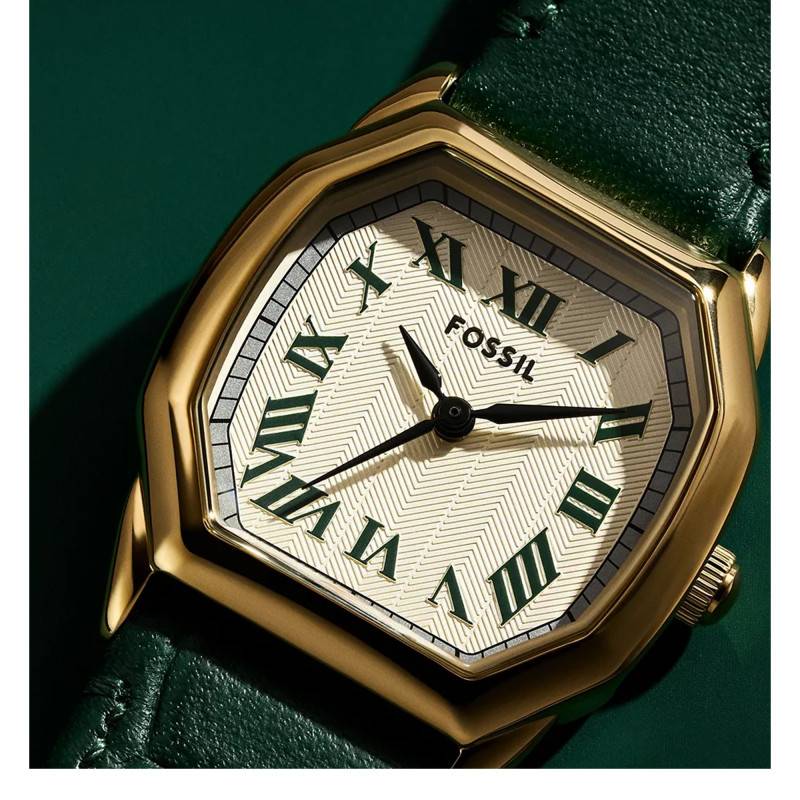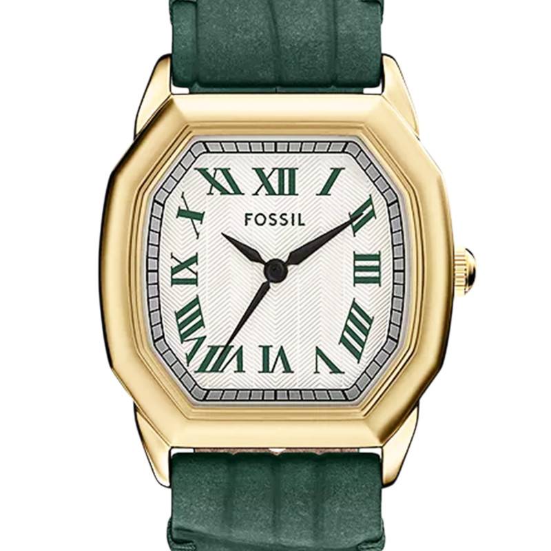 Le bracelet de la montre Fossil Raquel est réalisé en cuir de bovin d'une teinte verte raffinée et rehaussé par des surpiqûres discrètes qui accentuent sa texture. D'une largeur de 16 mm à l'entrecorne, il propose un équilibre parfait entre confort et esthétique, se mariant à la perfection avec le boîtier octogonal doré de la montre. Grâce à une boucle ardillon traditionnelle, le bracelet assure une tenue fiable tout en restant facile à ajuster, apportant ainsi une touche finale classique à ce garde-temps exquis. Le choix du cuir de bovin, non seulement durable mais aussi élégant avec sa patine qui se développe avec le temps, présente un confort supérieur et une respiration idéale du poignet. Ce bracelet, par sa qualité et son design, est un élément clé conférant à la montre une allure intemporelle.