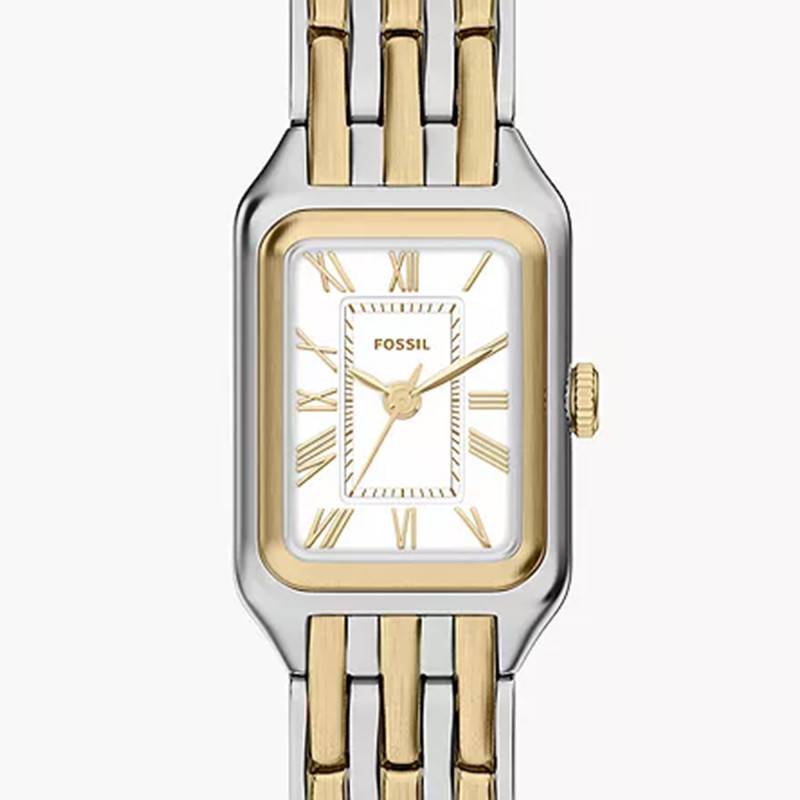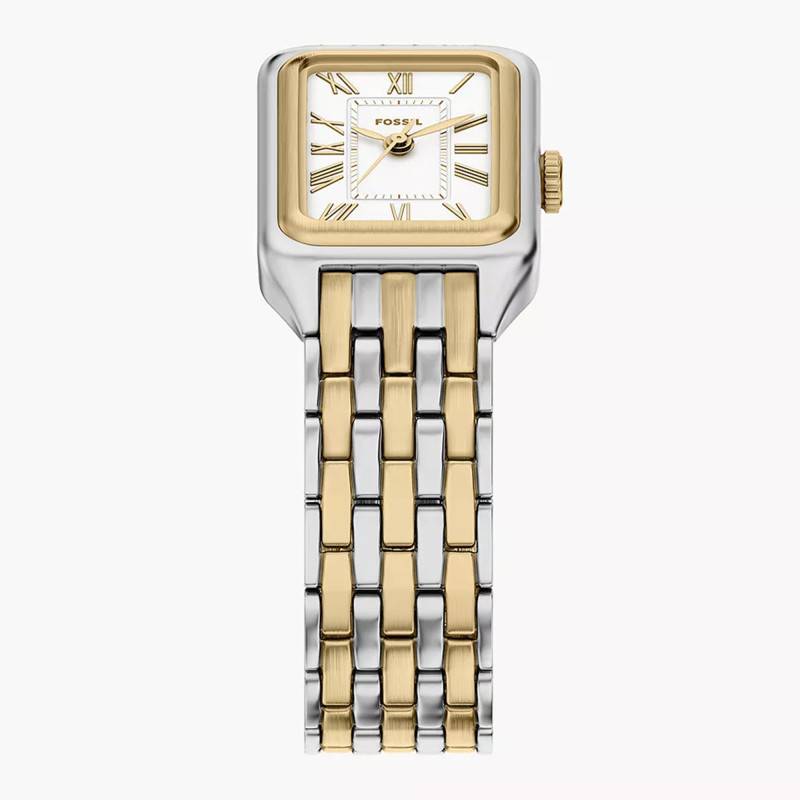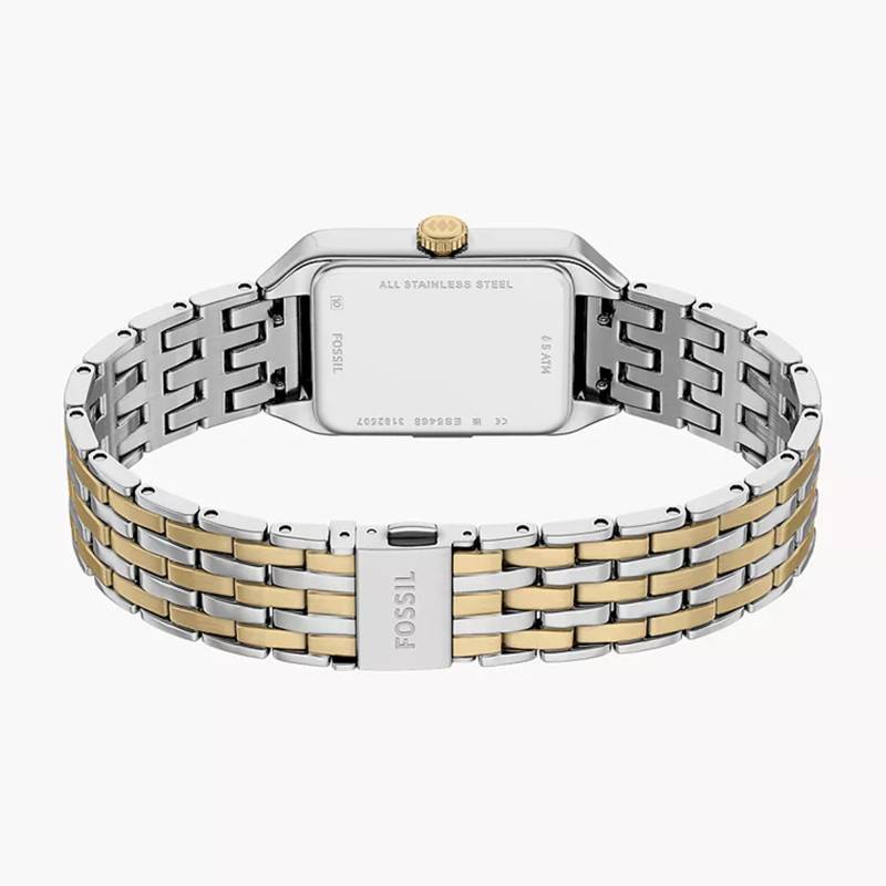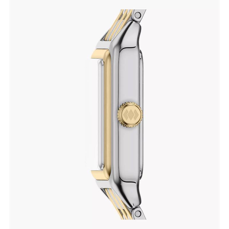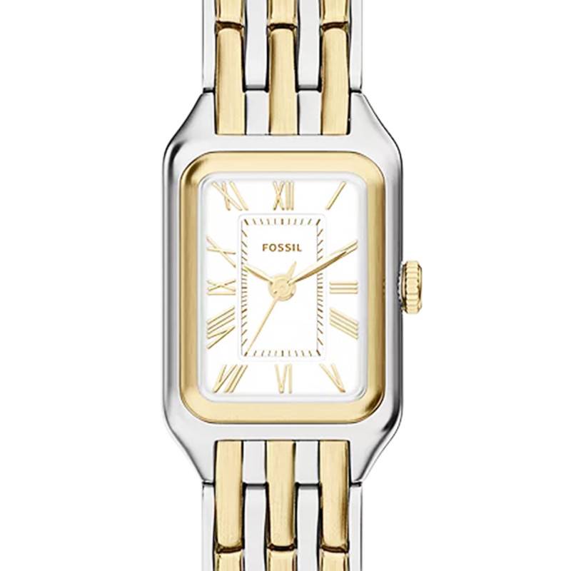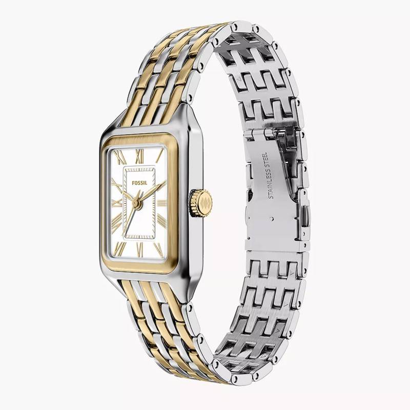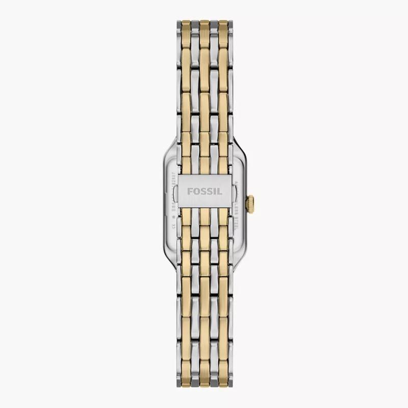 Le bracelet de la Fossil Raquel est un véritable atout de style. Composé d'acier inoxydable et d'acier PVD Gold, il présente une élégante bichromie gris et jaune qui s'harmonise parfaitement avec le boîtier de la montre. Sa finition polie accentue l'éclat du modèle. Le bracelet arbore une construction robuste avec une boucle déployante simple pour un confort d'usage et une sécurité optimale. Avec une entrecorne de 10 mm, il s'ajuste délicatement au poignet tout en offrant une durabilité exceptionnelle.