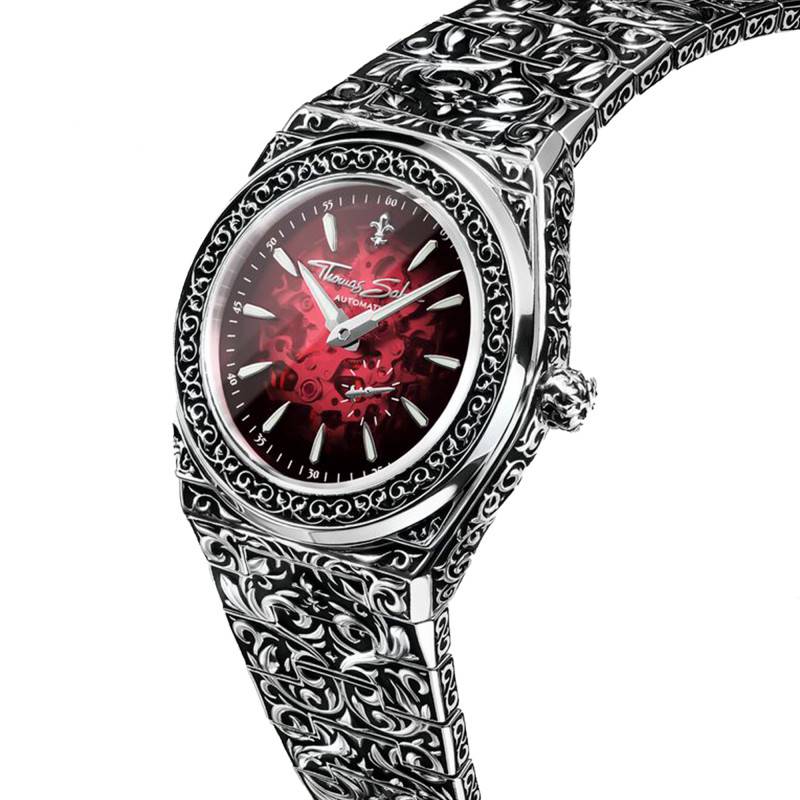 La Thomas Sabo Rebel at Heart est un garde-temps qui se distingue par son caractère affirmé et son souci du détail. Le boîtier rond de 42 mm est réalisé en acier inoxydable, offrant une durabilité exceptionnelle et une esthétique raffinée. La finition du boîtier est robuste, et le choix d'un fond vissé transparent permet d'apprécier la mécanique complexe de cette pièce horlogère. La montre est couronnée par un verre saphir, reconnu pour sa résistance aux rayures et son traitement antireflets qui élimine les reflets indésirables, garantissant une lisibilité parfaite quelles que soient les conditions d'éclairage.