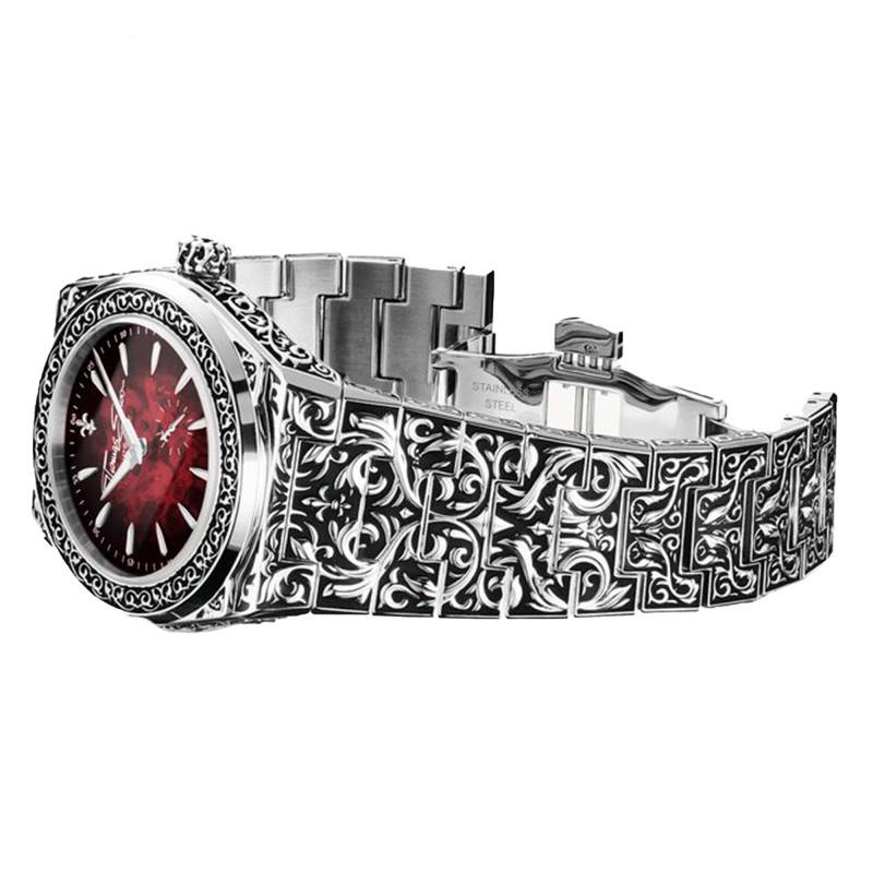 Le bracelet de cette montre, réalisé en acier inoxydable, frappe par sa fusion audacieuse de gris et noir, assortissant impeccablement le boîtier. Conçu pour l'homme soucieux de l'esthétique, il est orné de motifs complexes qui ajoutent une dimension artistique à cette pièce. Le bracelet se ferme avec une boucle déployante, assurant un ajustement sécurisé et confortable pour le poignet, idéal pour une utilisation quotidienne.