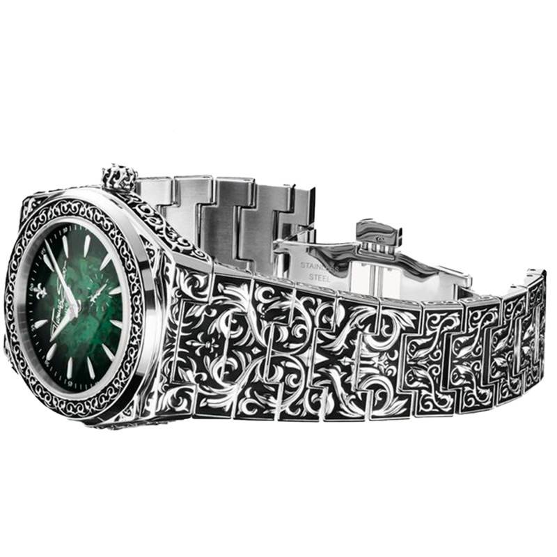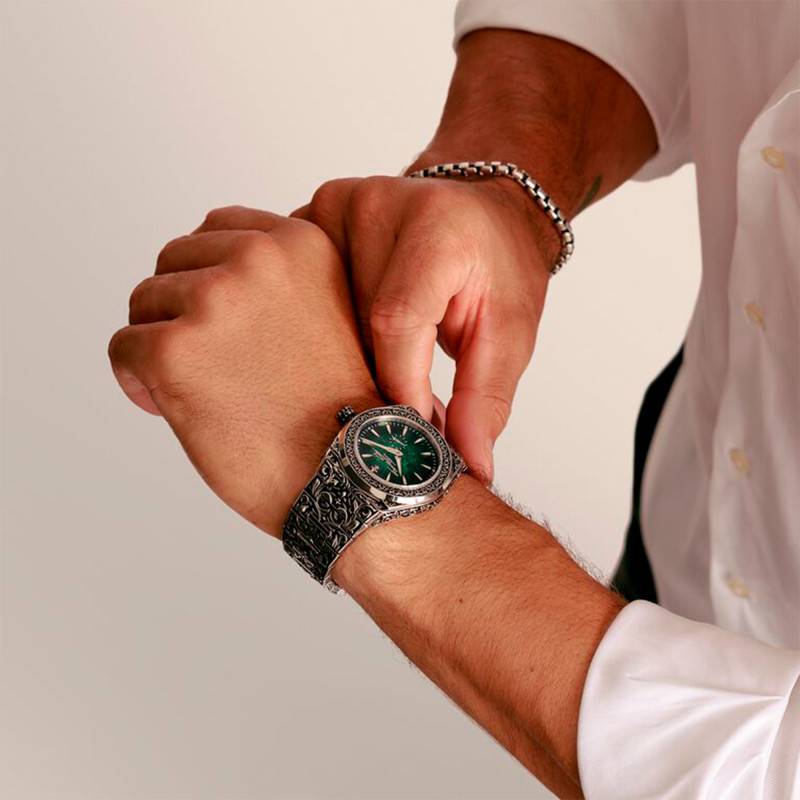 Le bracelet de cette montre est une œuvre de robustesse et d'élégance, réalisé en acier inoxydable avec des tons gris et noir qui complètent parfaitement l'ensemble. Le bracelet se distingue par une boucle déployante, offrant non seulement une sécurité accrue mais aussi une facilité d'usage.