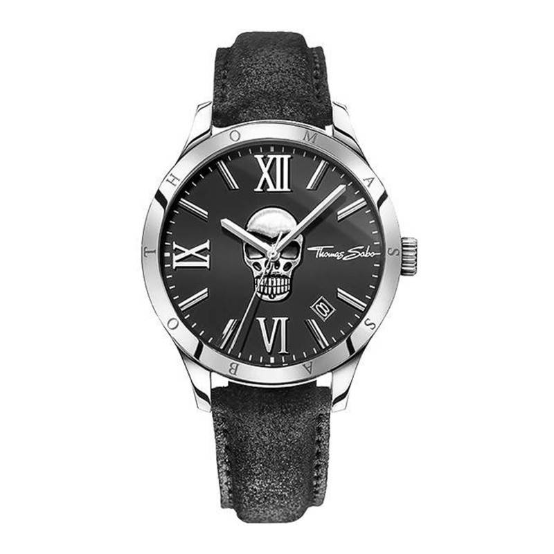 Un cadran de forme arrondie vient compléter la pièce horlogère. C'est lorsque vous regardez celui-ci que le nom du modèle prend tout son sens. En effet, il arbore une envoûtante couleur noire accompagnée d'une tête de mort stylisée visible en son centre. Des index en forme de bâtons et en chiffres romains marquent les heures sur le pourtour du cadran. De couleur argentée, ils sont accompagnés d'un chemin de fer des minutes teinté de la même couleur. Ainsi, une lecture de l'heure précise vous est présentée. Par ailleurs, trois aiguilles, de couleur argentée également, sont visibles au centre du cadran. Les deux aiguilles bâtons indiquent les heures et les minutes. Quant à la fine aiguille, la trotteuse, elle vous donne les secondes. Afin que vous ayez la notion du temps à chaque instant, un guichet-date loge entre quatre et cinq heures. Pour finir, Thomas Sabo signe sa création de sa plus belle plume à trois heures.