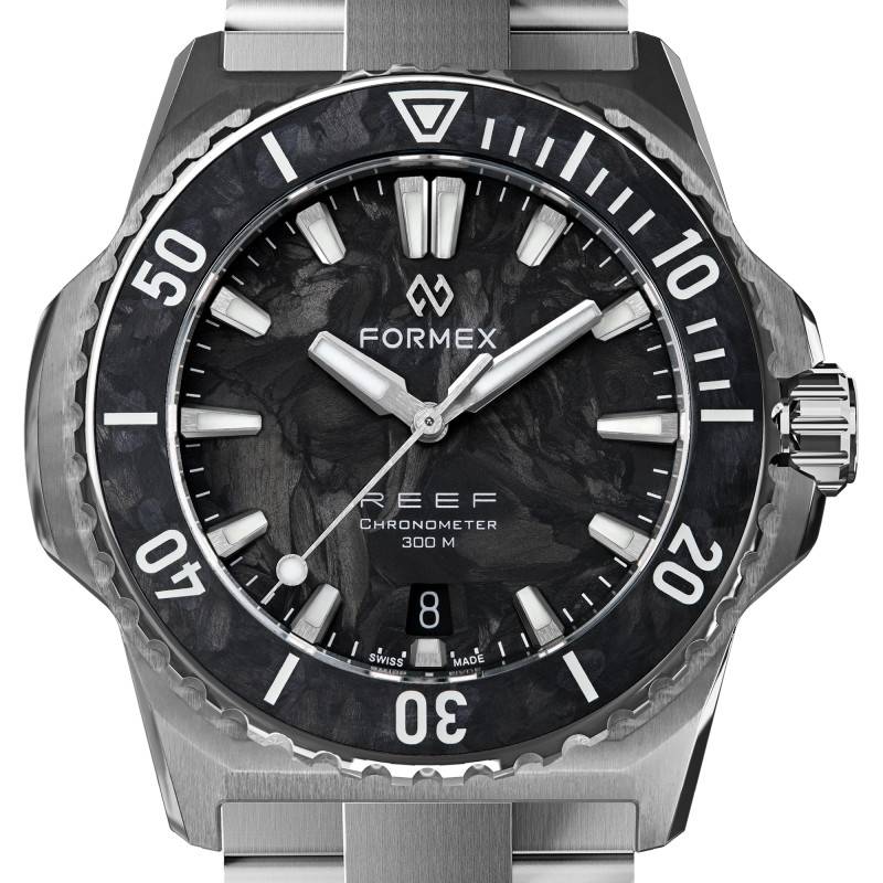 La montre Formex Reef 39,5 mm Forged Carbon est un véritable bijou d'ingénierie, combinant élégance et fonctionnalité. Son boîtier rond, réalisé en acier inoxydable 316L, présente un diamètre de 39,5 mm et une épaisseur de 11 mm, garantissant ainsi un port confortable au quotidien. Pesant seulement 75 grammes, il est léger tout en étant robuste, parfait pour les personnes actives. La finition polie et mate de son boîtier ajoute non seulement un aspect visuel sophistiqué, mais aussi une résistance accrue aux rayures et aux chocs.