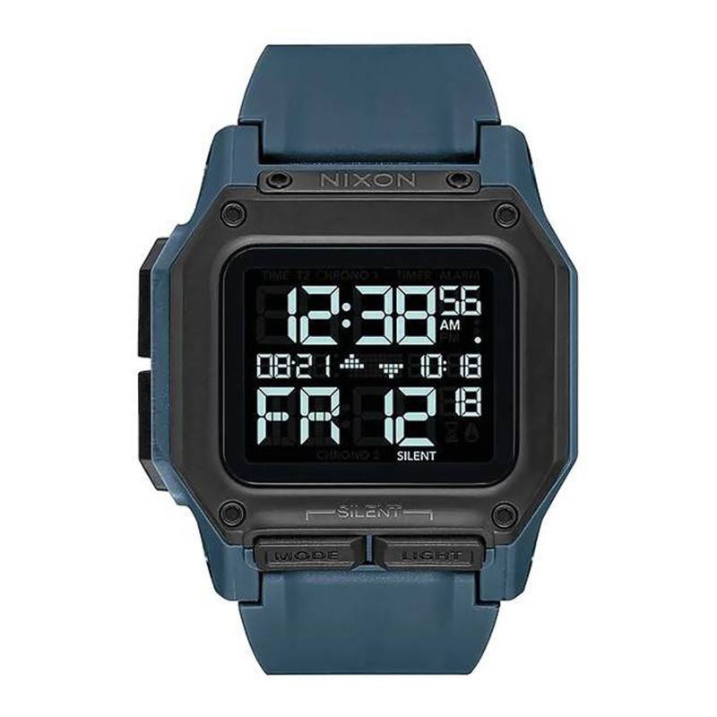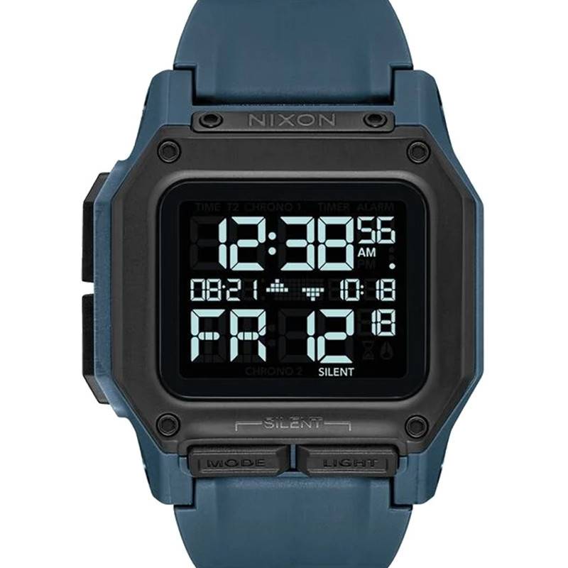 Nixon présente sa montre digitale Regulus connue comme étant la montre la plus robuste de la marque. Développée avec les Forces spéciales américaines, cette montre est résistante aux chocs, ultra-étanche, équipée d'une batterie autonome pour cinq ans et dotée de fonctionnalités telles que le double horaire, le mode silencieux, le rétroéclairage LED réglable et trois alarmes indépendantes. Il s'agit du garde-temps idéal pour les plus grands aventuriers à la recherche d'un compagnon de poignet résistant aux conditions les plus extrêmes, prêt à surmonter toutes les épreuves. La montre Regulus Dark Slate A1180 2889-00 détient un boîtier octogonal en plastique bleu de 46 mm. Ses quatre boutons poussoirs sont en polycarbonate. Une lunette noire maintenue par des vis entoure le cadran. Ce dernier est protégé des chocs par un verre minéral durci. Pour finir, son fond de boîte est maintenu par des vis pour une meilleure étanchéité. Étanche jusqu'à 10 atmosphères, ce garde-temps vous accompagnera dans vos plus folles aventures, qu'elles soient sur terre ou dans l'eau.