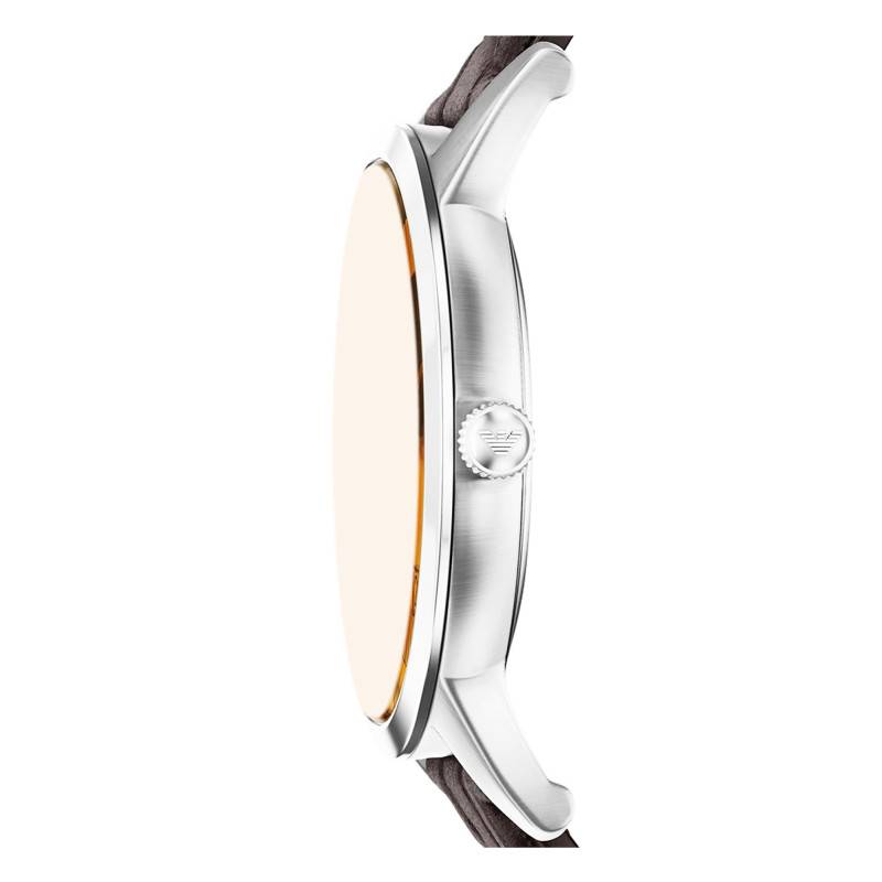 La Montre Renato de Emporio Armani se distingue par son allure raffinée et intemporelle. Ce modèle arbore un boîtier rond en acier inoxydable, mesurant 43 mm de diamètre, parfait pour les poignets masculins. Sa finition polie et brillante capte la lumière avec élégance, soulignant son caractère à la fois moderne et classique. Avec une épaisseur de 8 mm, elle présente un profil fin qui s'accorde avec des tenues formelles comme décontractées. Le fond de la boîte est emboîté, assurant une apparence soignée et une sécurité optimale pour les composants internes. Ce garde-temps est équipé d'un verre minéral plat qui protège efficacement le cadran tout en offrant une bonne lisibilité.