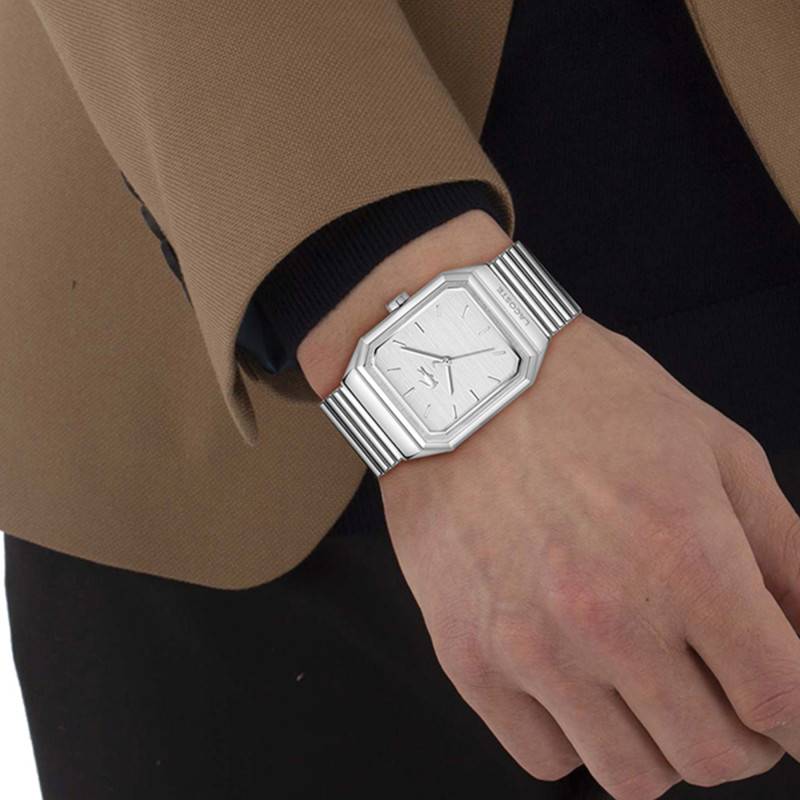 La montre René de Lacoste incarne l'alliance parfaite entre style moderne et fonction pratique. Conçue spécifiquement pour les hommes, elle se distingue par son boîtier rectangulaire en acier inoxydable dont la finition gris polie confère un aspect à la fois urbain et sophistiqué. Avec un diamètre de 31 mm et une épaisseur de 8 mm, ce garde-temps offre une présence discrète mais marquée au poignet, parfaite pour les amateurs de design épuré. Le boîtier est dominé par une lunette en acier inoxydable, contribuant à l'esthétique contemporaine et robuste de cette montre. Le poids de 96 g assure un port confortable tout en affirmant une qualité de fabrication supérieure. Un seul bouton remontoir situé à droite du boîtier facilite le réglage des fonctions horaires.