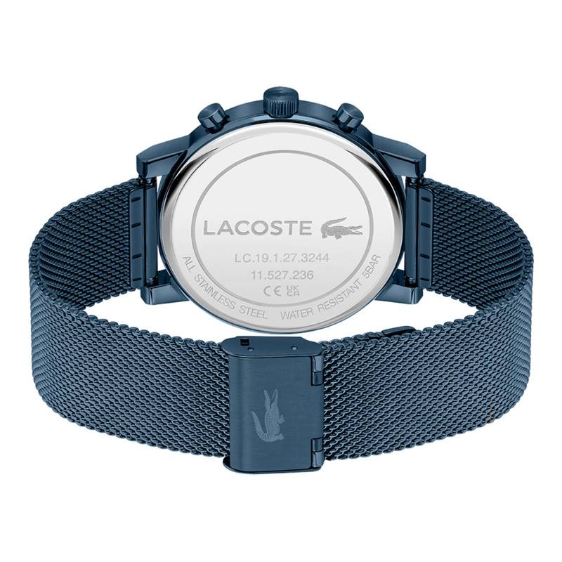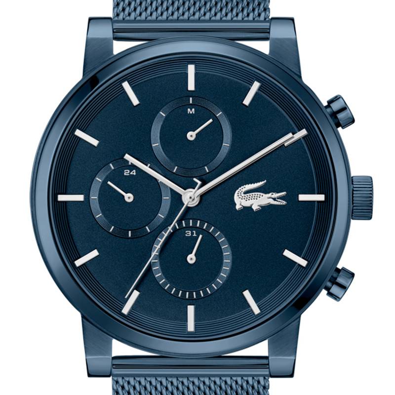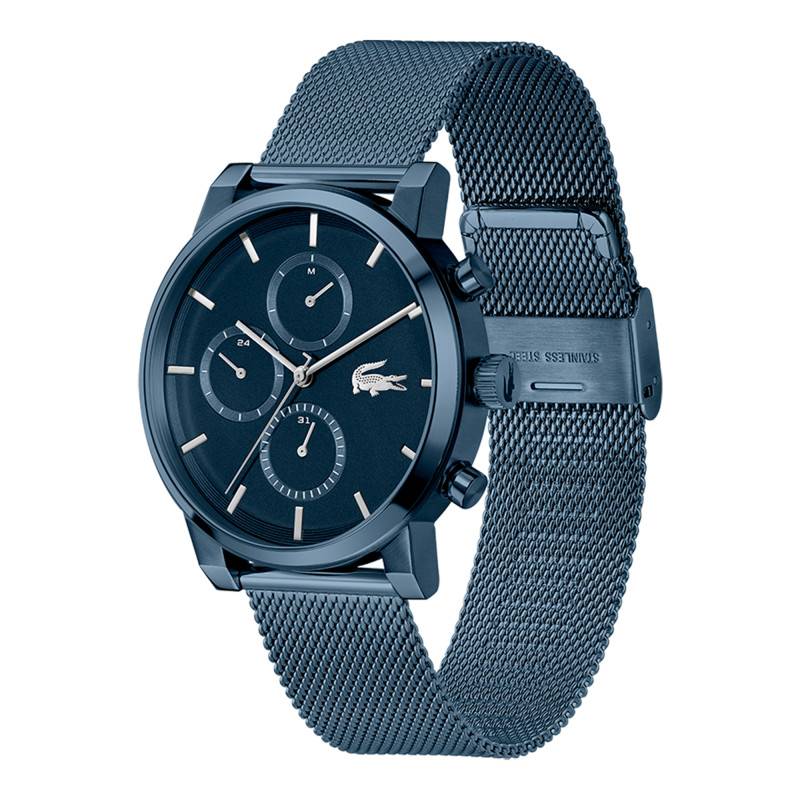 La montre Lacoste se présente avec une allure résolument moderne grâce à son boîtier rond élaboré en acier inoxydable et rehaussé par une finition PVD bleu. Son diamètre généreux de 44 mm lui confère une présence affirmée au poignet. La robustesse de l'acier est sublimée par le traitement PVD, offrant non seulement une esthétique unique mais également une résistance à l'usure. Le choix d'un fond de boîte emboîté se traduit par une esthétique épurée tout en apportant une assurance en termes de durabilité. Par ailleurs, la lunette est fabriquée en acier inoxydable, renforçant l'identité visuelle de ce modèle grâce à ses lignes fluides et harmonieuses. Avec son verre minéral plat, la montre bénéficie d'une transparence totale, optimisant la lisibilité tout en lui procurant une élégance indéniable.