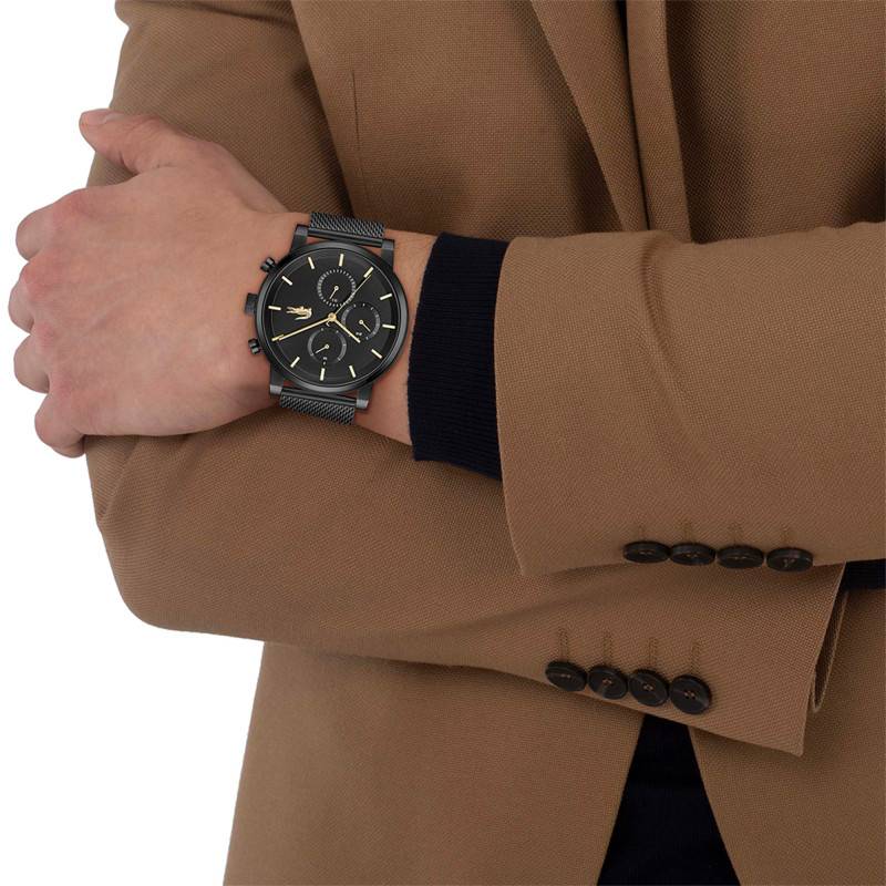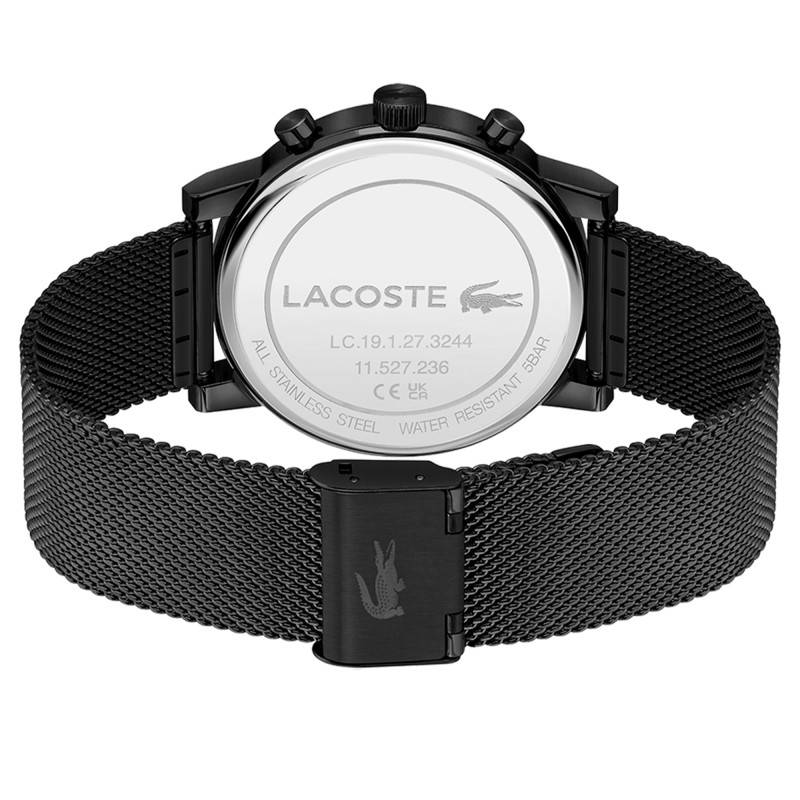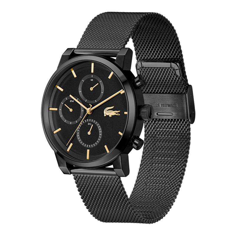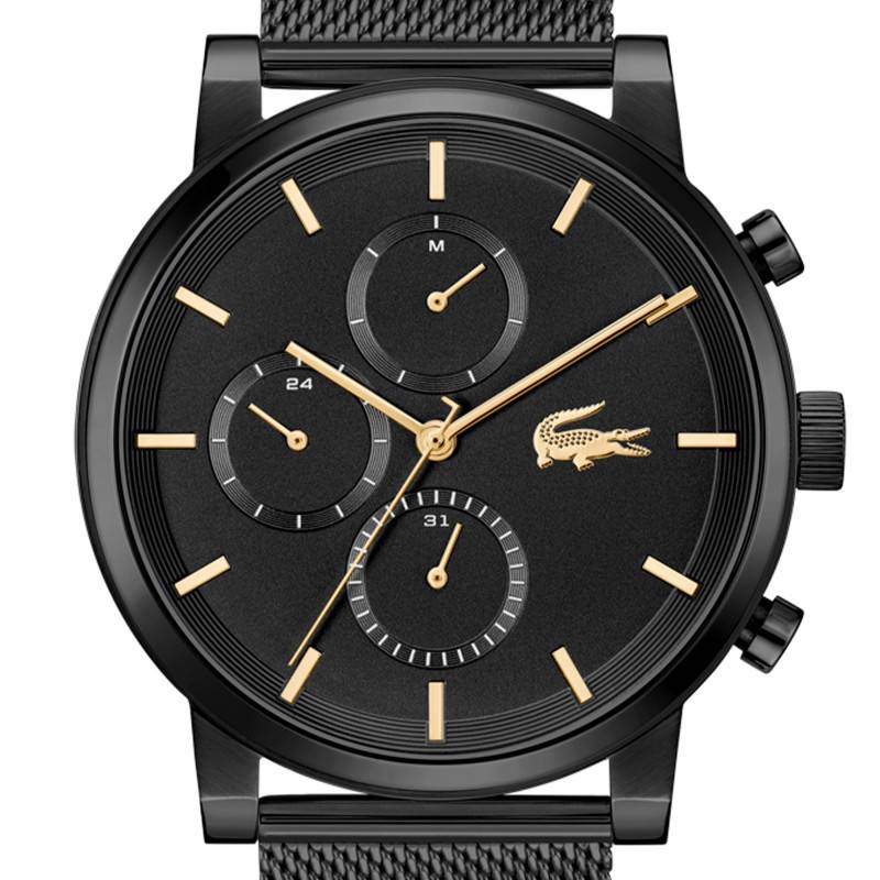 La montre Lacoste est une fusion intemporelle d'élégance et de fonctionnalité. Son boîtier rond en acier inoxydable présente une finition PVD noir assurant une solidité et une élégance affirmées. Avec un diamètre de 44 mm, cette montre est idéale pour ceux qui recherchent une présence à la fois discrète et remarquable. Le fond de boîte emboîté renforce cette solidité, optimisant la protection du mouvement interne tout en offrant une étanchéité de 5 ATM, parfaite pour une utilisation quotidienne et des activités occasionnelles autour de l'eau. Les boutons, dont un bouton remontoir et deux boutons poussoirs, sont harmonieusement intégrés à la structure, ajoutant à la fois esthétique et utilité.