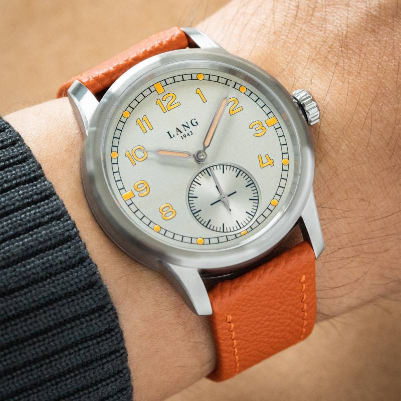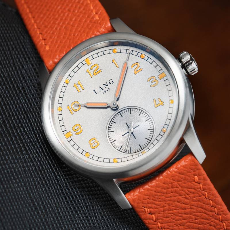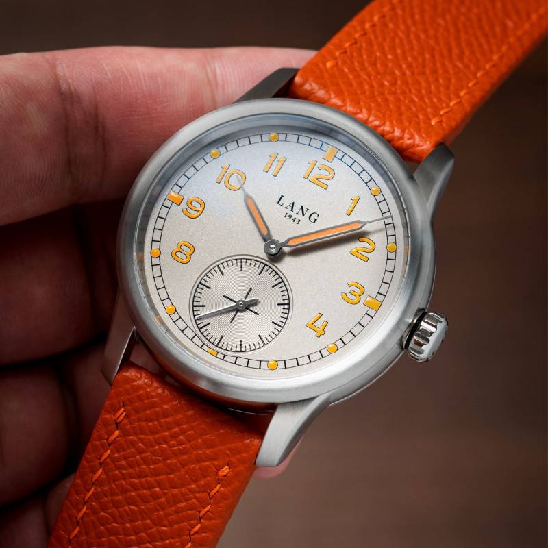 Lang 1943 est une marque horlogère qui conçoit et commercialise des montres sous une variété de styles pour satisfaire les goûts les plus exigeants. Des modèles classiques aux plus complexes, elle incarne l'alliance parfaite entre tradition et innovation. Les matériaux utilisés pour la fabrication de ses créations sont d'une qualité exceptionnelle pour en faire des modèles durables et fonctionnels. Cette entreprise est un symbole de prestige et d'élégance intemporelle grâce à ses collections aux allures chic et moderne. Dans la collection Rétro, se trouve cette splendide montre Orange réalisée en édition limitée de 25 exemplaires. Elle dispose d'un boîtier de forme ronde fabriqué en acier inoxydable. Il est embelli par une couleur argentée et une finition brossée pour plus de caractère. Celui-ci mesure 39 mm de diamètre et 8,40 mm d'épaisseur, dimensions résolument pensées pour convenir parfaitement à toutes les tailles de poignet. Le cadran restera intact face aux chocs extérieurs grâce au verre saphir bombé qui surplombe le boîtier. Il est doté de revêtements antirayures et antireflet qui vous permettront d'effectuer une lecture temporelle impeccable des indicateurs tout en assurant une bonne résistance aux rayures. Ce garde-temps est équipé d'un bouton remontoir installé à 3 heures qui permet de régler à tout moment les heures, les minutes et les petites secondes. Au verso, se trouve le fond de boîte gravé et maintenu par des vis qui assure une étanchéité de 5 ATM. Il arbore une fenêtre transparente à travers laquelle vous pourrez admirer les rouages du mécanisme.