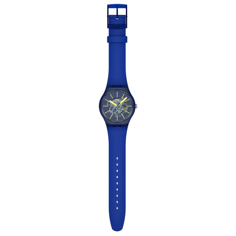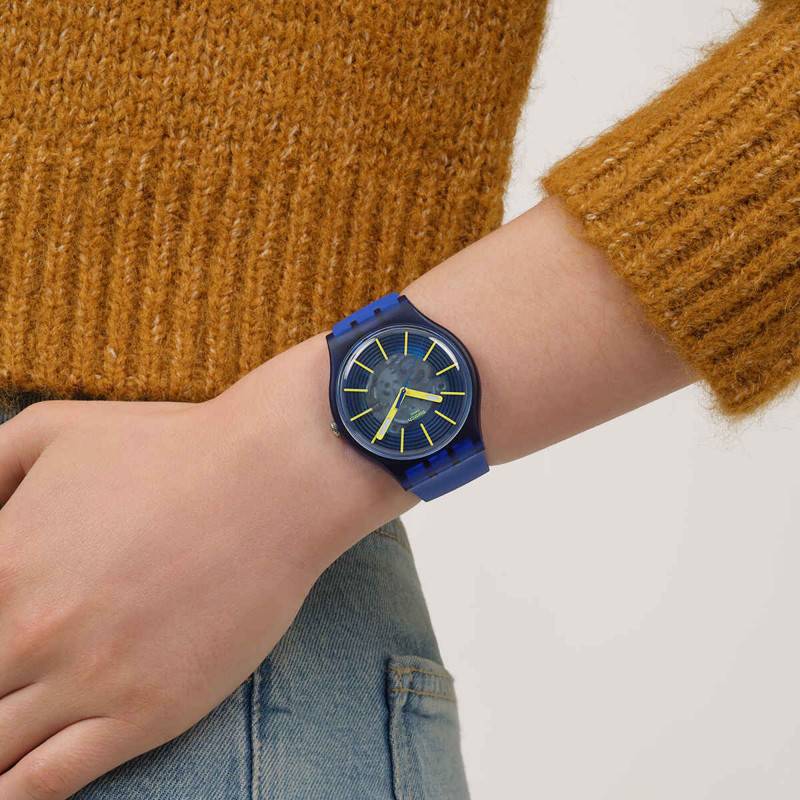 Le cadran de la montre Swatch Revealed In The Depths présente une finition coeur ouvert fascinante. Ce design permet d'apprécier le fonctionnement interne du mouvement, exposant partiellement les rouages et les mécaniques souvent réservées aux montres plus haut de gamme. Avec son affichage analogique (aiguilles), il offre une lecture de l'heure classique mais jamais démodée. Les aiguilles luminescentes ajoutent une fonctionnalité précieuse, permettant une lecture aisée même dans des conditions de faible luminosité. Le cadran principalement bleu apporte une dimension de profondeur et d'élégance, tout en soulignant le style contemporain et audacieux de cette création horlogère.