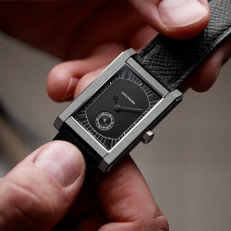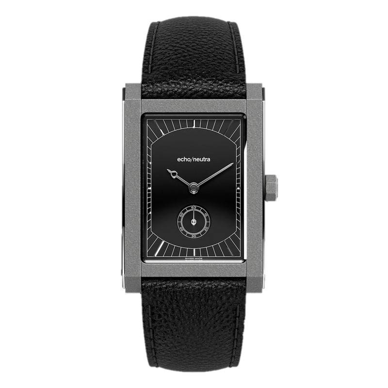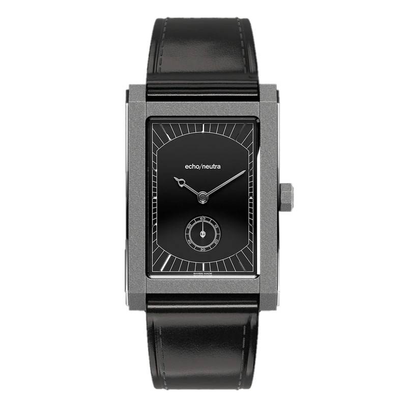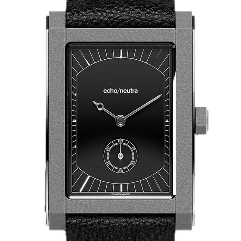 D'origine suisse, Echo/Neutra est connue pour ses garde-temps hautement équipés, sophistiqués et durables. Ses modèles combinent une esthétique moderne avec des techniques horlogères traditionnelles, garantissant des montres qui ne sont pas seulement des instruments de mesure du temps, mais aussi des objets chargés d'histoire. Ils sont travaillés avec minutie par des maîtres horlogers expérimentés et dotés d'un savoir-faire incroyable. Découvrez la montre Rivanera noir arborant un design captivant destinée à orner les poignets des hommes avec aisance. Pesant 21 gr, elle est munie d'un boîtier au style minimaliste et remarquable qui lui confère une belle allure. Rectangulaire, il est fabriqué en titane grade 5, un alliage composé de 90 % de titane, 6 % d'aluminium et 4 % de vanadium pour une excellente robustesse et se trouve mis en avant par des finis sablé et poli. Il mesure 27 mm de largeur sur 40 mm de longueur avec une épaisseur de 5,50 mm. Il est surmonté par un verre saphir robuste donnant une épaisseur de 5,90 mm et protégeant le cadran des chocs potentiels. À 3 heures, il est doté d'une couronne grise assurant une bonne prise en main et qui permet de manipuler les éléments centraux fixés sur le cadran. Le fond de boîte gravé et maintenu par des vis lui assure une étanchéité de 3 ATM. Transparent, il vous accordera une vue imprenable sur les oscillations du mouvement.