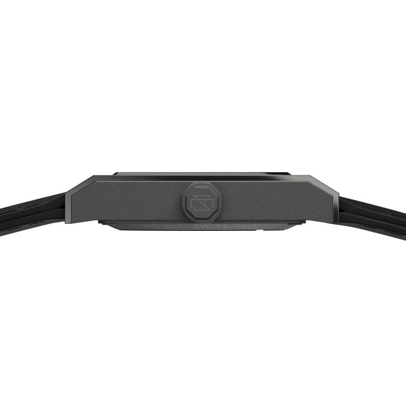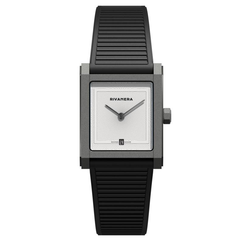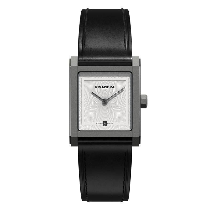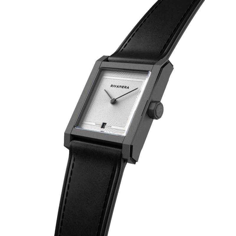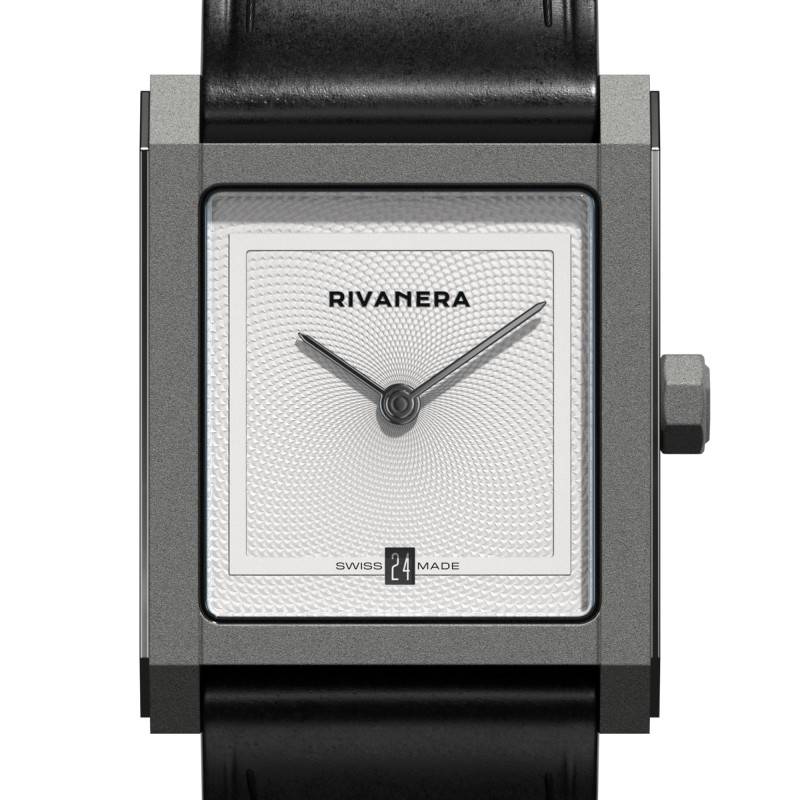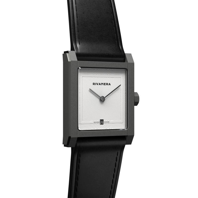 La montre Rivanera Piccolo se distingue par son boîtier rectangulaire en titane de grade 5, une matière connue pour sa robustesse et sa légèreté incomparable. Les dimensions compactes de 33 mm sur 26 mm et une épaisseur de 6,9 mm en font un choix idéal pour ceux qui recherchent un accessoire discret mais imposant par son allure. La finition sablée du boîtier lui confère une sophistication moderne, idéale pour un usage quotidien aussi bien que des événements formels. Le fond du boîtier est maintenu par des vis et présente un fond transparent, invitant l'observateur à apprécier le savoir-faire du mouvement qui l'habite.