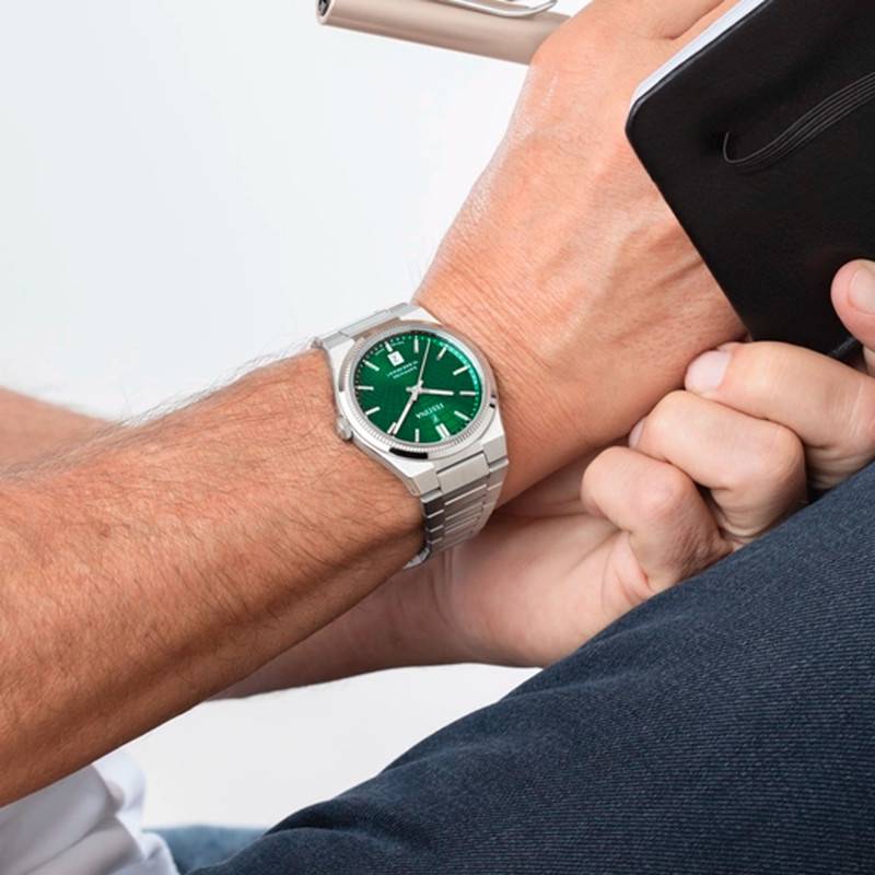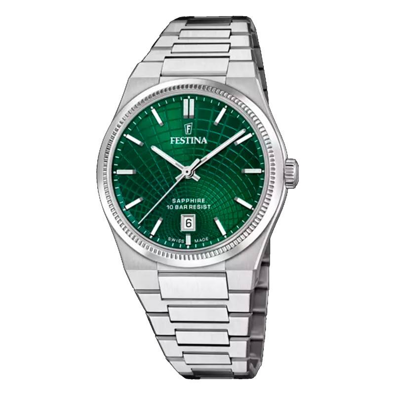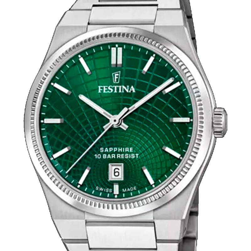 Arborant une magnifique couleur verte et une finition à motif géométrique, ce cadran se pare d'indicateurs assurant une lecture juste et claire sous toutes les conditions. Son pourtour est longé par un chemin de fer des minutes aux graduations blanches et par des index bâton affichant les heures. Ces marqueurs seront pointés par les trois aiguilles qui vous indiqueront les heures par la courte, les minutes par la grande et les secondes grâce à la fine. La précision du temps est d'autant plus accentuée par le guichet date prenant place à 6 heures. Enfin, en guise de signature, Festina appose sa signature sous le double index de midi.