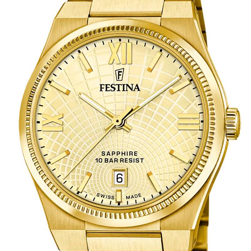 La montre que nous avons ici incarne l'élégance sophistiquée à chaque détail. Le boîtier de forme ronde est forgé en acier inoxydable 316L, un matériau reconnu pour sa robustesse et ses qualités hypoallergéniques. Ce boîtier, d'un diamètre de 40 mm et d'une épaisseur de 8,75 mm, est agréablement léger avec un poids de seulement 117 grammes. Ce calibre de construction assure une portabilité confortable au poignet tout en offrant une résistance fiable. La finition extérieure PVD jaune sublime le style de cette montre avec un effet poli et brillant, soulignant une allure à la fois moderne et luxueuse. La lunette présente un effet cannelé, une touche esthétique qui rehausse le caractère distinctif de ce garde-temps.