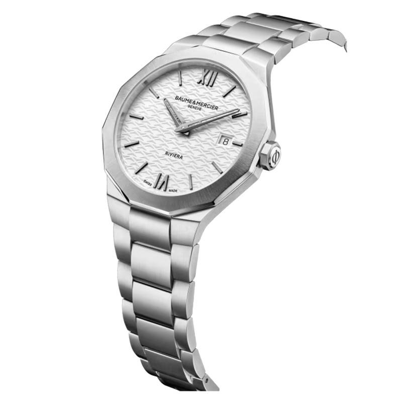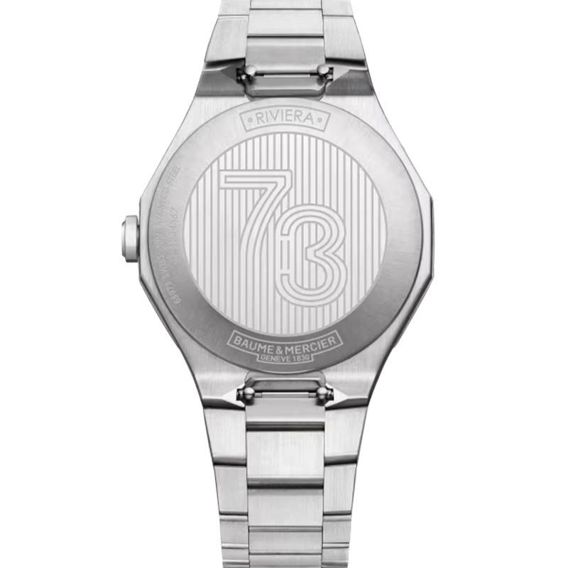 La montre Riviera de Baume & Mercier constitue l'incarnation parfaite de l'élégance moderne et du savoir-faire suisse. Son boîtier en acier inoxydable, avec une finition à la fois polie et satinée, confère à cette montre un aspect à la fois robuste et sophistiqué. Sa forme dodécagonale est unique et attire instantanément le regard. La lunette en acier renforce l'aspect audacieux de ce modèle qui saura étonner. Le fond de boite est de type emboité, garantissant une finition nette et une protection solide. Avec son diamètre de 39 mm, ce garde-temps est parfaitement dimensionné pour convenir à une clientèle à la recherche de style et de raffinement.