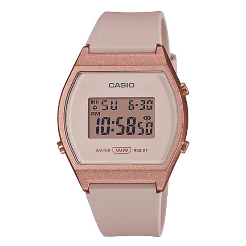 Pour faire suite à la collection Casio Vintage LW-203, la marque japonaise Casio vous présente sa LW-204-4AEF en résine rigide et à l'affichage digital. Très lumineuse, celle-ci est composée d'un boîtier dans les tons roses ainsi que d'un bracelet de couleur subtilement plus clair, cette différence entre ces deux éléments permet de jouer avec les différentes nuances de rose et d'apporter une touche d'originalité, quel que soit le poignet qui la portera. Très légère et discrète, elle mesure 38,9 mm de longueur, 35 mm de largeur et 9,4 mm d'épaisseur pour un poids total de 24 grammes. Cette montre ne dispose pas d'un boîtier étanche. La LW-204-4AEF est munie de part et d'autre du cadran de trois boutons poussoirs également de couleur rose afin de perpétuer une harmonie de couleurs. Ces boutons poussoirs ont pour but d'activer les différentes fonctionnalités disponibles sur celle-ci. Le cadran est, quant à lui, recouvert d'un verre acrylique résistant et dur afin d'assurer une meilleure protection.