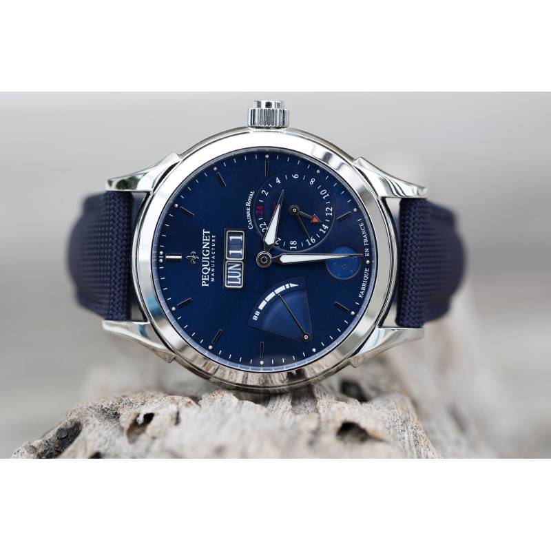 Cette pièce horlogère est dotée d'un mouvement automatique manufacturé par la maison Pequignet. Il s'agit du Calibre Royal créé par le laboratoire de Haute Horlogerie Pequignet de Morteau dans le Jura français. Sa fréquence d'oscillation est de 21'600 alternances par heure et il renferme une immense réserve de marche : 88 heures. Cela lui permet un isochronisme exceptionnel de 72h. Ce calibre alimente les heures, les minutes, la date, le jour, le 2nd fuseau horaire (GMT) et l'indicateur de jour/nuit. Vous êtes par ailleurs informés du niveau de la réserve de marche.