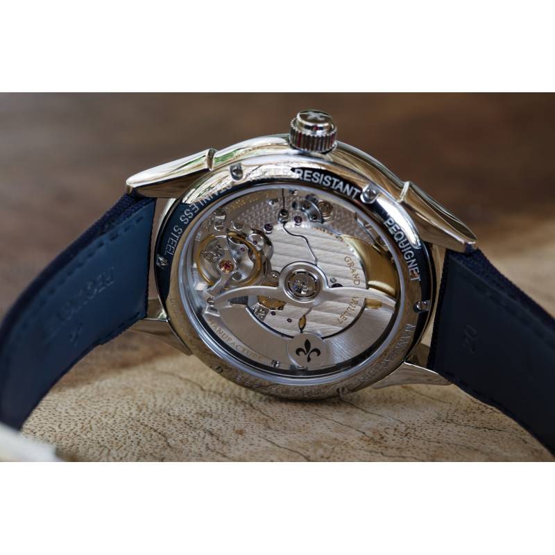 La maison horlogère française Pequignet détient un savoir-faire d'exception et révèle dans ses créations un sens du détail très aiguisé. La montre Royale GMT 9010973F CB présente une belle teinte bleu foncé. Son boîtier rond est composé d'acier inoxydable 316L argenté et il est minutieusement poli ce qui lui offre une finition lumineuse. Il mesure 42 millimètres de diamètre et pèse 46 grammes.. Les cornes du boîtier présentent un design unique et biseauté. Le verre qui protège le cadran et celui du fond de boîte sont des verres saphir d'excellente qualité et qui a ont été traité antireflet. De plus ce fond de boîte transparent est maintenu par 6 vis à têtes polies. Enfin, nous précisons que la couronne de réglage des aiguilles est décorée de l'emblématique fleur de lys de la marque Pequignet.