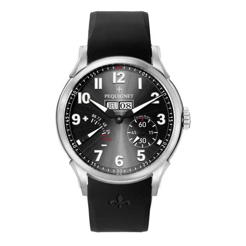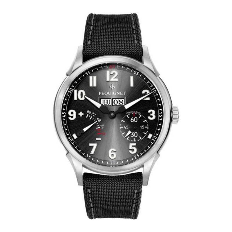 Marqué du Lys Royal, emblème de la marque, le cadran de ce modèle incarne l'élégance à la française. Il est sobre, relativement classique et très raffiné. Il s'inscrit dans le style des montres pilotes avec des grands index en chiffres arabes appliqués revêtues de Superluminova cloisonné. Leur teinte blanche offre un contraste saisissant avec le fond gris anthracite et soleillé du cadran. Le pourtour est marqué par un chemin de fer des minutes gradué par traits ainsi que des chiffres arabes de 5 en 5. L'ensemble sera pointé par deux aiguilles alpha qui, dotées d'un revêtement Superluminova, vous communiqueront les heures et les minutes même sous des conditions nocturnes. À 12h, sous le logo Pequignet, vous remarquerez la présence de deux guichets qui indiqueront la date et le jour en français. Alors qu'à 4h et à 8h se placent en symétrie parfaite un compteur petites secondes et un indicateur de réserve de marche, offrant une vue esthétiquement sophistiquée.