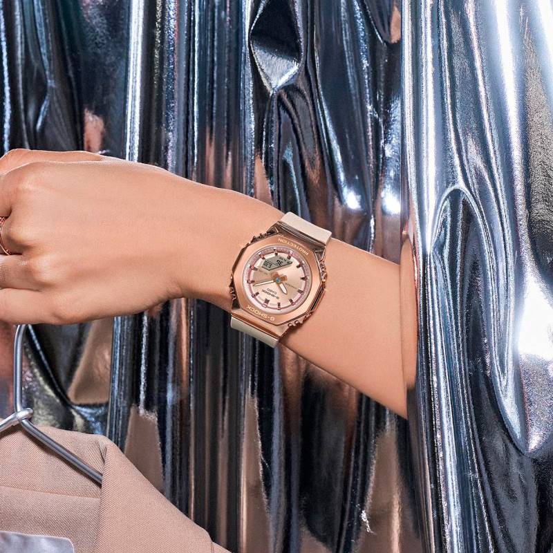 Casio est une célèbre marque japonaise qui propose des garde-temps performants et élégants. Elle fabrique des modèles arborant des styles variés et incarnant une forte résistance avec une fiabilité remarquable, ce qui vous garantit une expérience horlogère unique. Aujourd'hui, la marque est fière de vous présenter la montre GM-S2110PG-4AER issue de la collection S-Series Metal. Résistante aux chocs, elle présente une allure sophistiquée qui vous charmera à coup sûr. Ce modèle de la gamme G-Shock dispose d'un boîtier de couleur rosé conçu en acier inoxydable et résine avec un placage ionique. Celui-ci arbore une forme octogonale avec un poids de 56 gr. Il mesure 40,50 mm de diamètre et 45,90 mm de longueur pour une épaisseur de 11 mm. Parfait pour un port quotidien, il épousera le poignet des femmes avec finesse. Les quatre boutons-poussoirs, placés deux à deux aux extrémités du boîtier, permettront de contrôler toutes les fonctionnalités de la montre. Un verre minéral plat recouvre le cadran tandis que le fond de boîte maintenu par des vis garantit une étanchéité de 20 ATM.