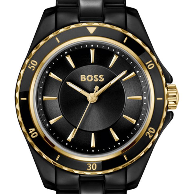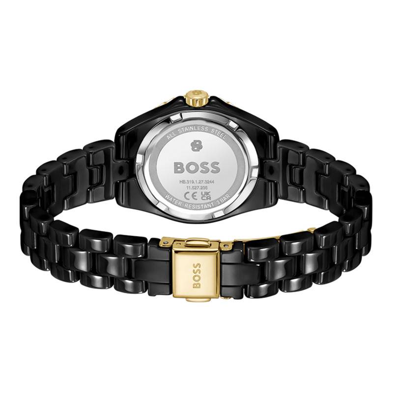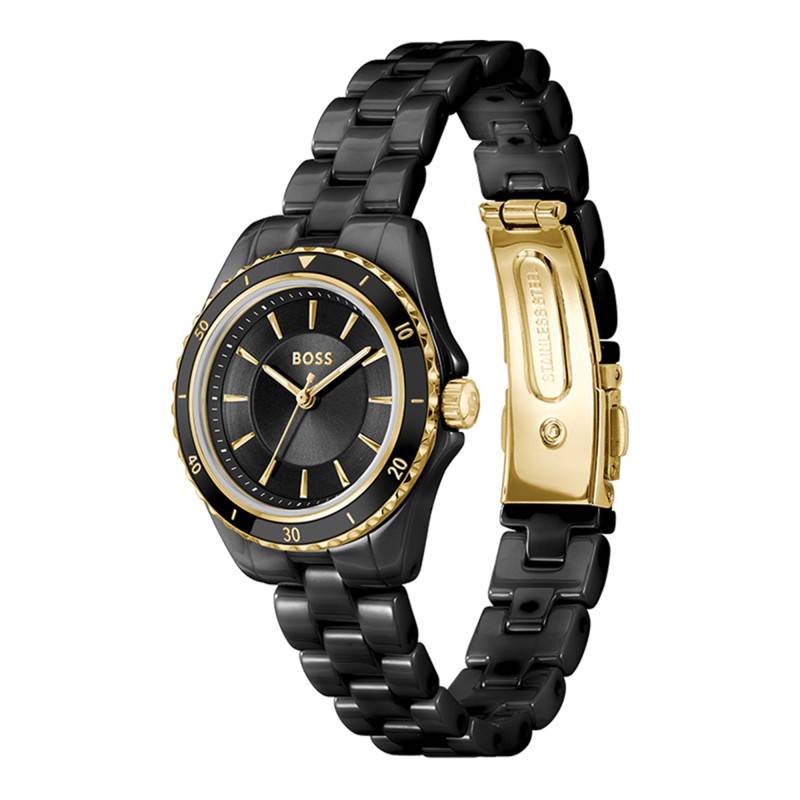 Le bracelet de cette montre Boss est conçu en céramique, une matière prisée pour sa beauté et sa durabilité. Sa teinte noire lui confère une élégance qui se marie parfaitement avec le boîtier. Doté d'une boucle déployante, il assure un maintien confortable et sécurisé au poignet.