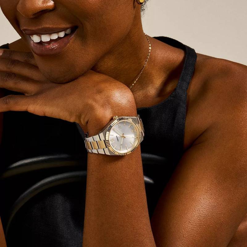 La maison horlogère Fossil vous propose un nouveau modèle dans sa collection Scarlette. Destinée aux femmes, cette montre chic et élégante habillera vos tenues avec la plus grande finesse. Elle arbore un boîtier rond, conçu en acier inoxydable, avec de l'acier PVD or jaune. Ce dernier mesure 32 millimètres de diamètre pour 9 millimètres d'épaisseur. Le cadran est protégé des chocs et des rayures par une délicat verre minéral. Ce dernier est entouré d'une lunette fixe sertie de strass, qui accentue l'élégance de la montre. Aussi, une couronne remontoir prend place à 3 heures et permet de régler les aiguilles facilement et rapidement. Enfin, notez que ce modèle est étanche jusqu'à 50 mètres de profondeur, notamment grâce à son fond de boîte emboîté.