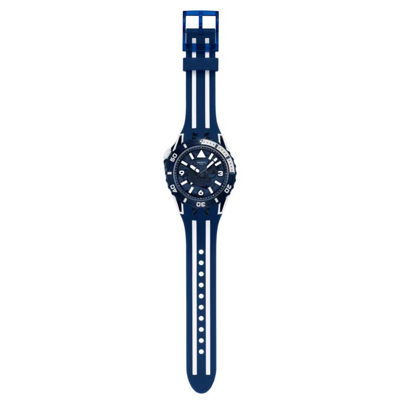 Le bracelet distinctif en silicone de couleurs bleu et blanc de la montre Scubaqua Sea Wasp allie à la fois confort et style. La boucle ardillon en assure une fermeture sécurisée et intuitive. Le choix du silicone est non seulement pour son confort léger, mais aussi pour sa durabilité et sa résistance à l'eau, alignant délibérément la fonction avec l'esthétique de la montre destinée aux aventuriers maritimes.